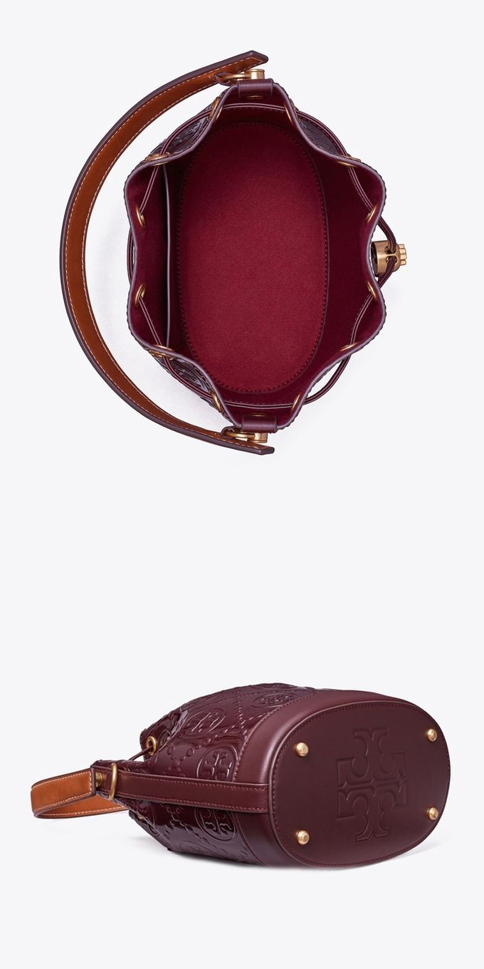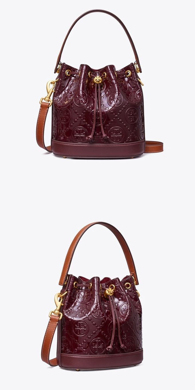 漆皮浮雕LOGO素色束口水桶包/兩用包 (酒紅)