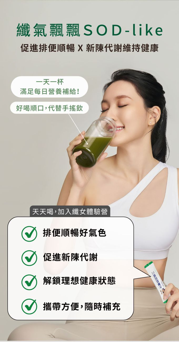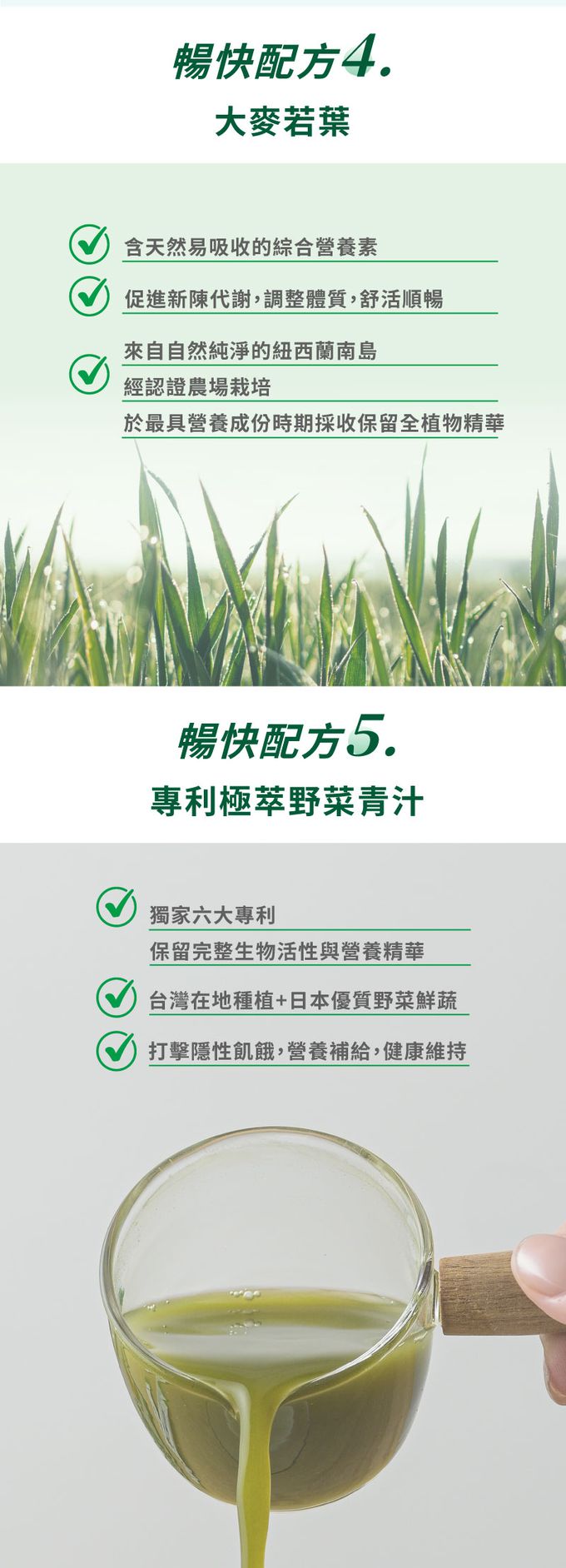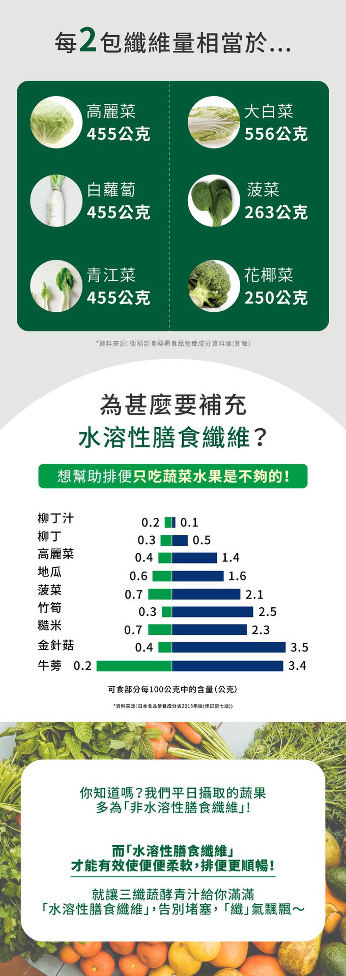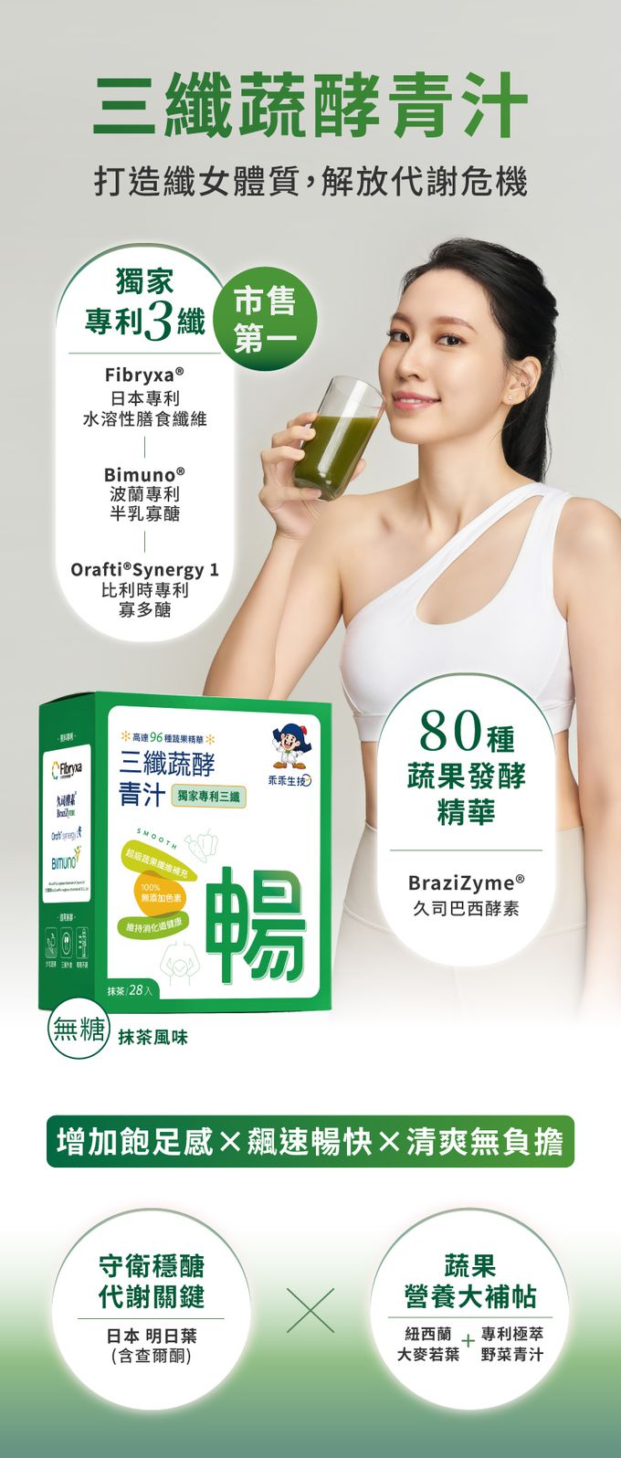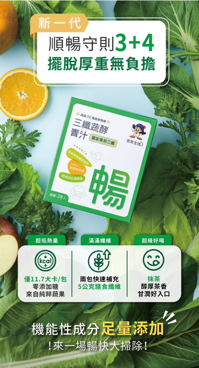 成分:Fibryxa*水溶性膳食總維、半乳寡糖(Bimuno*)、抹茶粉、專利極萃野菜青汁蔬菜粉(含大麥若葉、桑葉、極萃 野菜青汁(菠菜、羽衣甘藍、小松菜、小白菜、青江菜、青油菜、地瓜葉、小芥菜、廣島菜、山荷蒿、黑葉白菜、高麗菜 )、小麥若葉、明日葉)、Orafti synergy1菊登纖維、巴西蔬果發發酵物(含糊精、昆布、裙帶菜、紫菜、香菇、檸檬馬鞭 草、苦艾、西番蓮、金盞草、大飛掃草、牛筋草、檸檬草