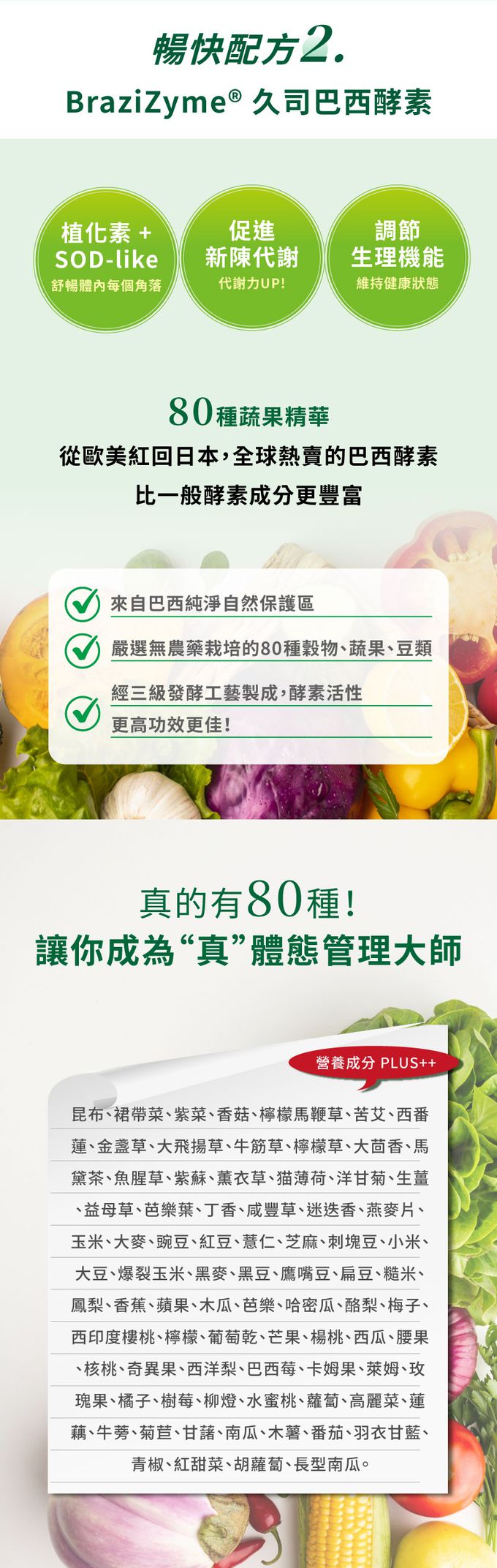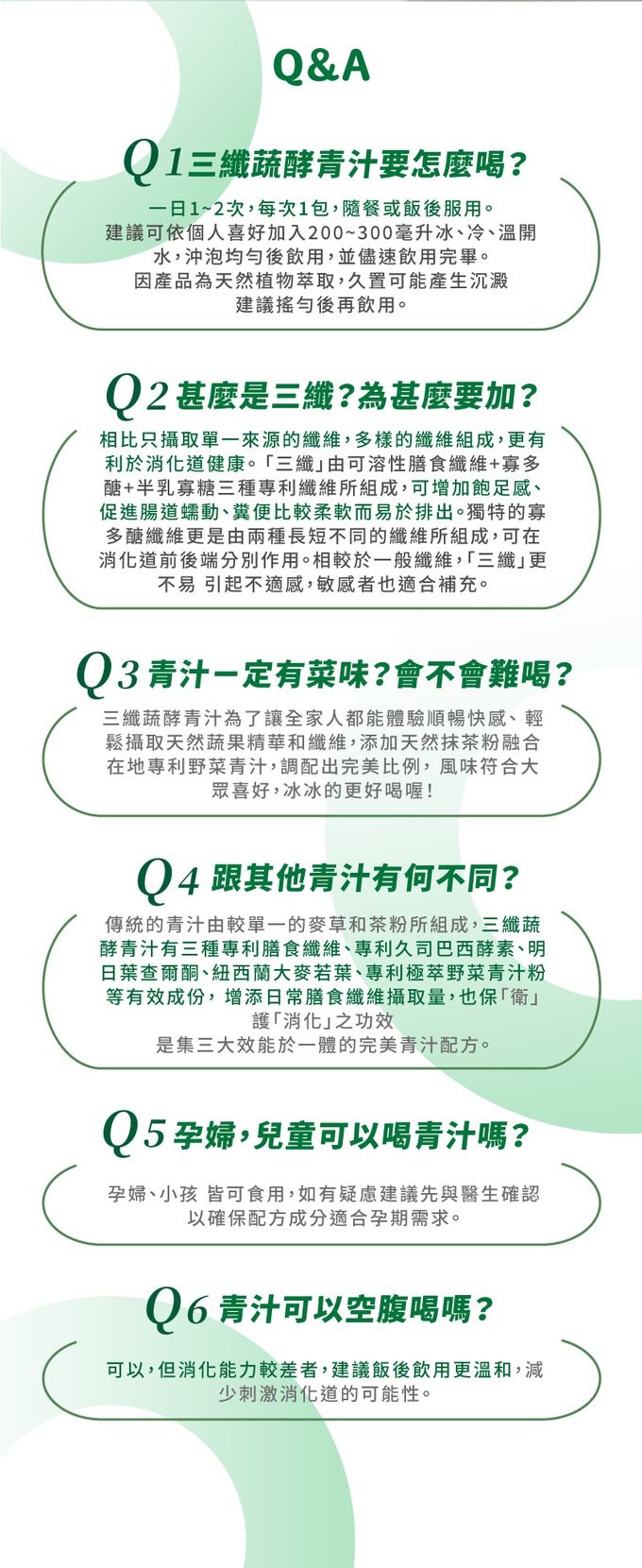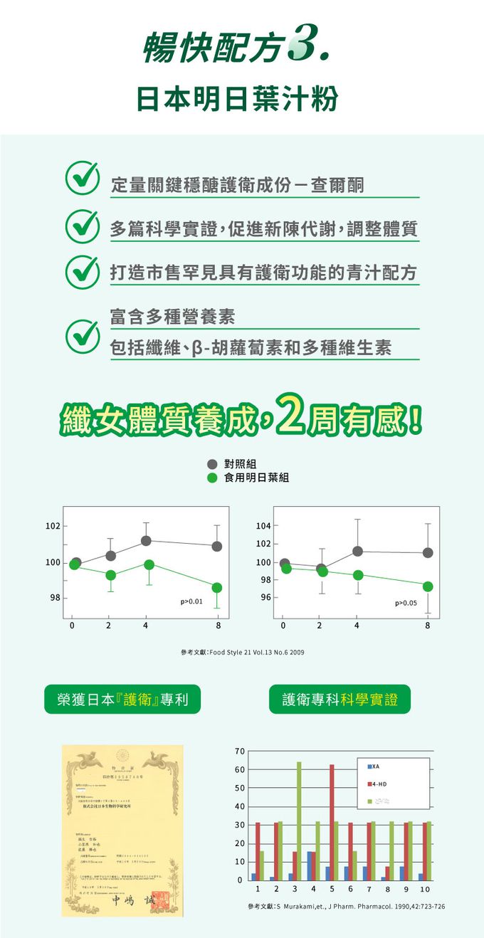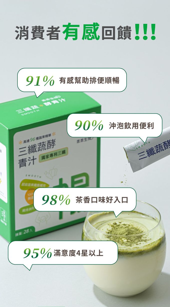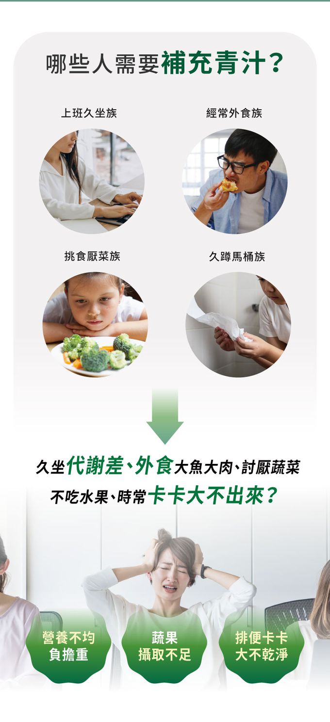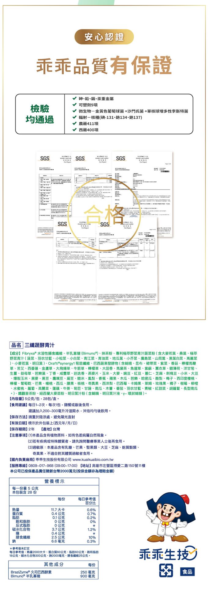 成分:Fibryxa*水溶性膳食總維、半乳寡糖(Bimuno*)、抹茶粉、專利極萃野菜青汁蔬菜粉(含大麥若葉、桑葉、極萃 野菜青汁(菠菜、羽衣甘藍、小松菜、小白菜、青江菜、青油菜、地瓜葉、小芥菜、廣島菜、山荷蒿、黑葉白菜、高麗菜 )、小麥若葉、明日葉)、Orafti synergy1菊登纖維、巴西蔬果發發酵物(含糊精、昆布、裙帶菜、紫菜、香菇、檸檬馬鞭 草、苦艾、西番蓮、金盞草、大飛掃草、牛筋草、檸檬草