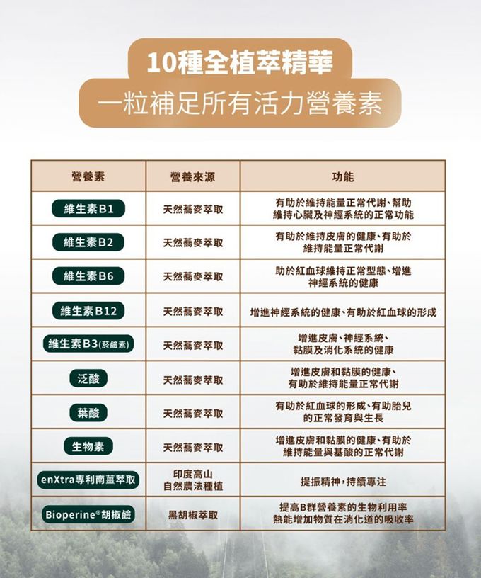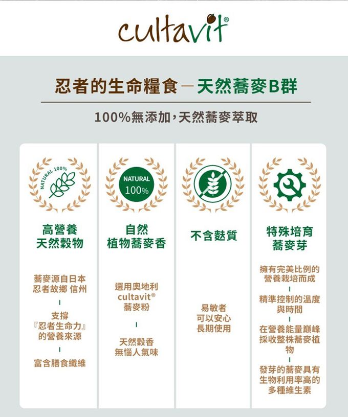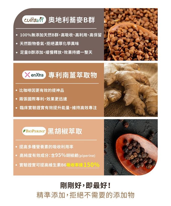 成分:蕎麥粉(含維生素B群)、南薑萃取物(南薑萃取物、麥芽糊精、二氧化砂)、麥芽糊精、 硬脂酸鎂、二氧化矽、胡椒鹼Bioperine