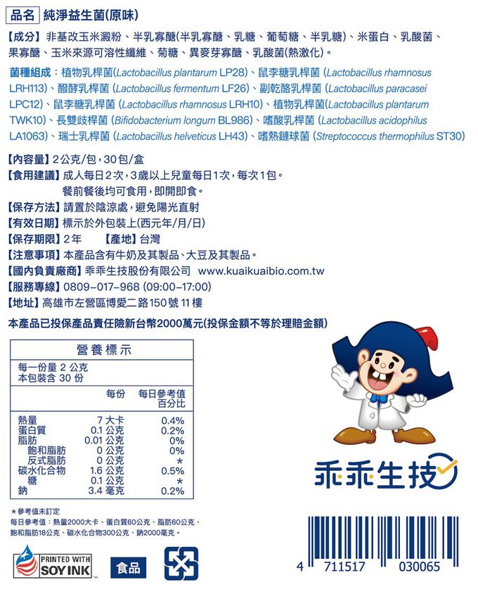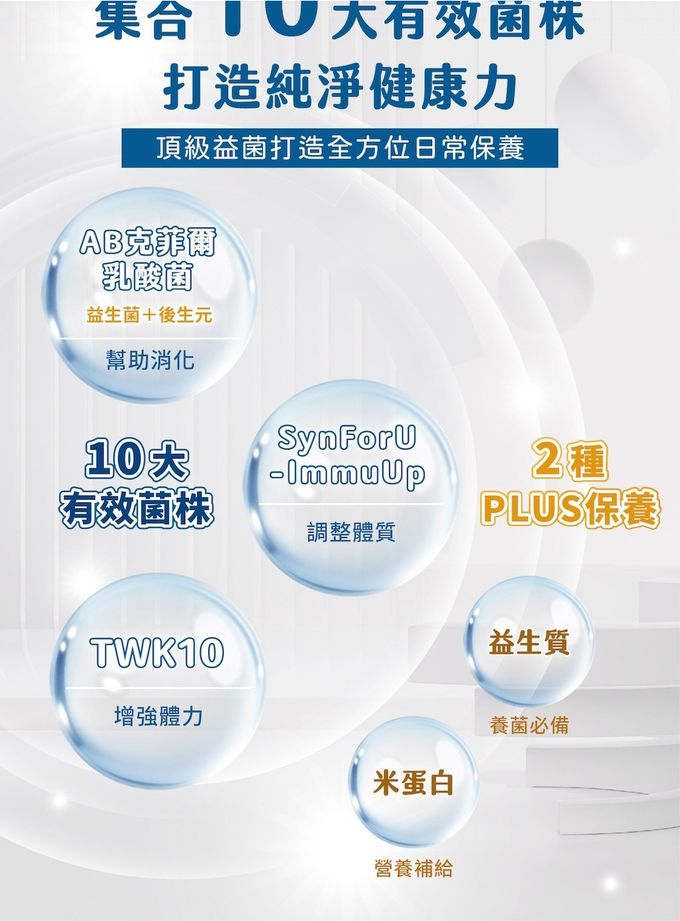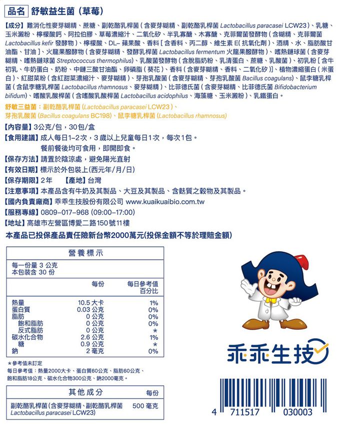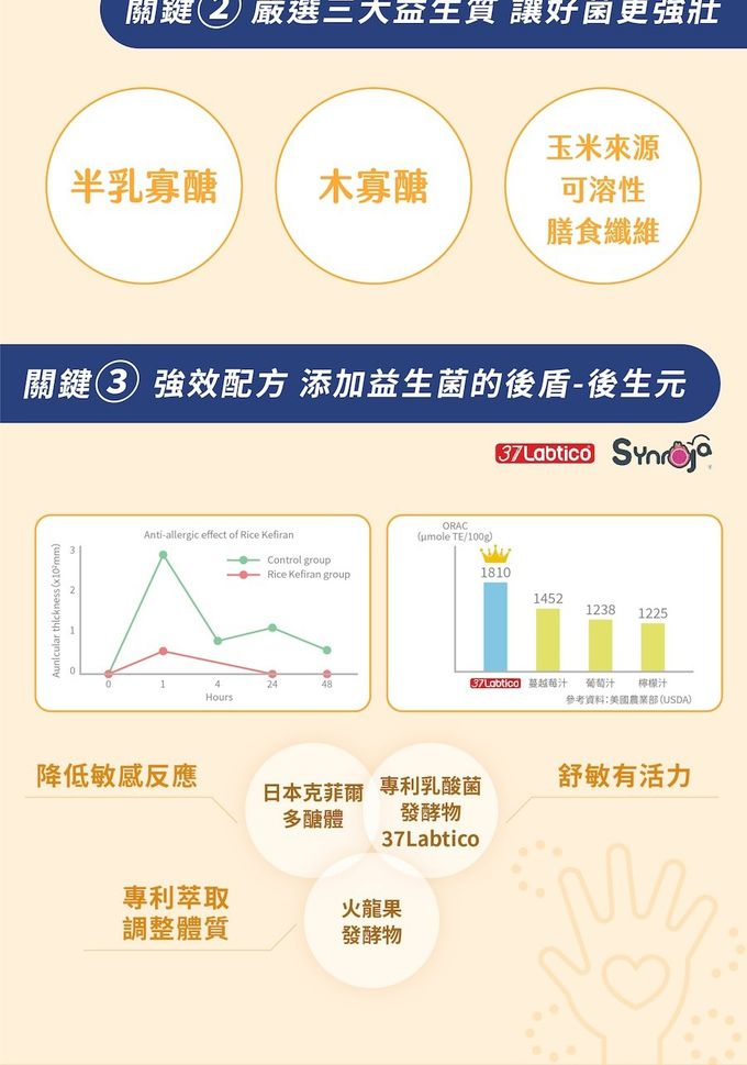 成分:非基改玉米澱粉、半乳寡醣(半乳寡醣、乳糖、葡萄糖、半乳糖)、米蛋白、乳酸菌、 果寡醣、玉米來源可溶性纖維、菊糖、異麥芽寡醣、乳酸菌(熱激化)