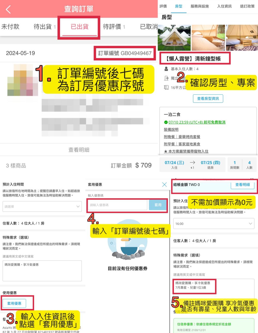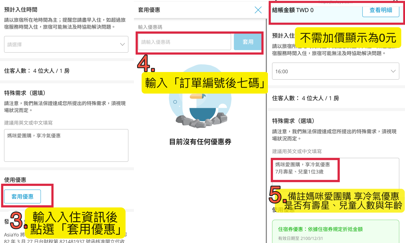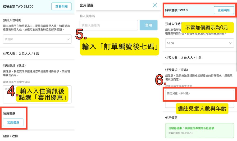※ 步驟4 依步驟選擇入住日期及人數 → 於付款前點選「套用優惠」並於輸入優惠碼欄位填寫【 媽咪愛訂單編號後七碼 】→ 點選「套用」即可依本專案優惠結帳並完成訂房。