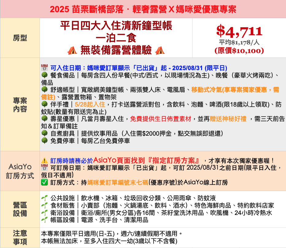 註:凡5/28起入住打卡送AsiaYo露營派對禮包,數量有限,送完為止。