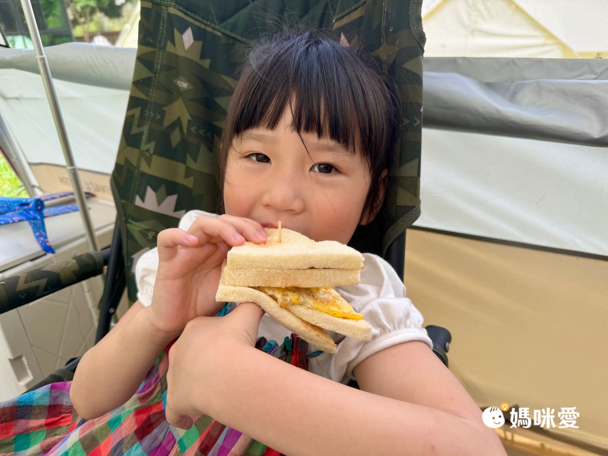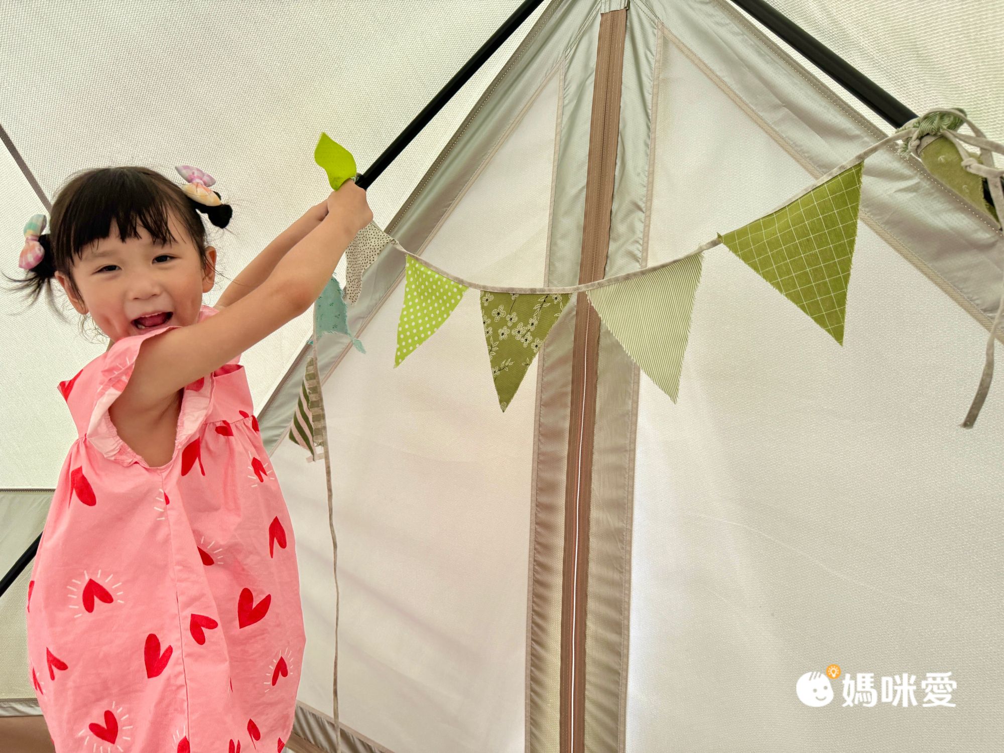 紅豆選了這塊三角旗說要佈置我們的帳篷,媽媽只有協助她綁喔!完成之後兄妹倆迫不及待在帳篷內合影了好幾張