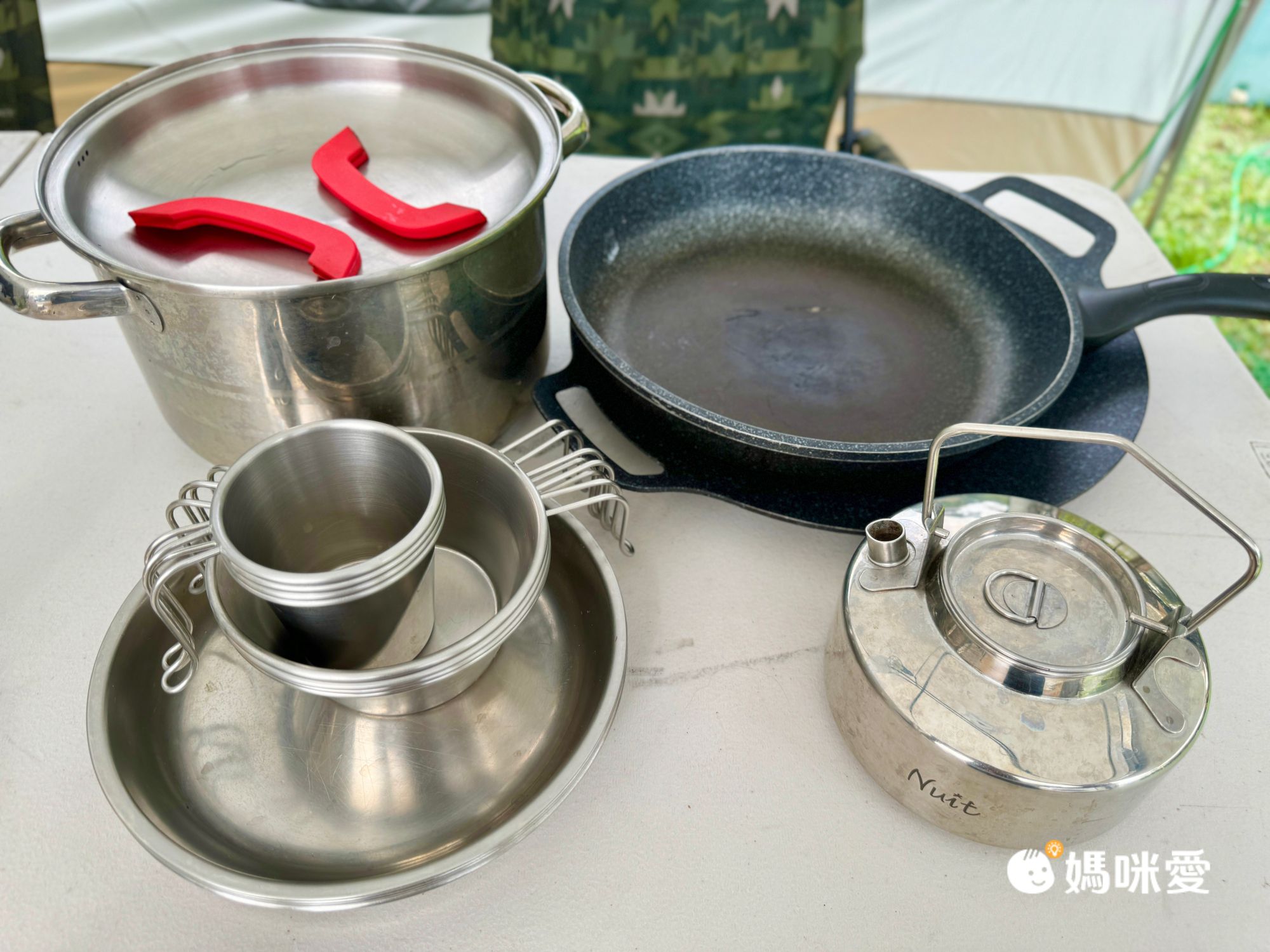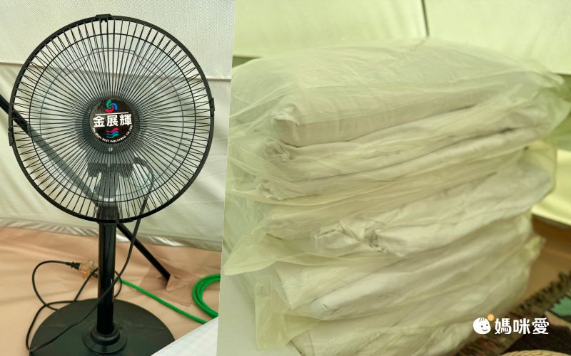 客廳帳內有電風扇、鍋具、餐碗盤、平底鍋、烤盤、卡式爐及刀具器材8件組(退房基本上就是清點這些東西,完整歸還就會退押金喔~)