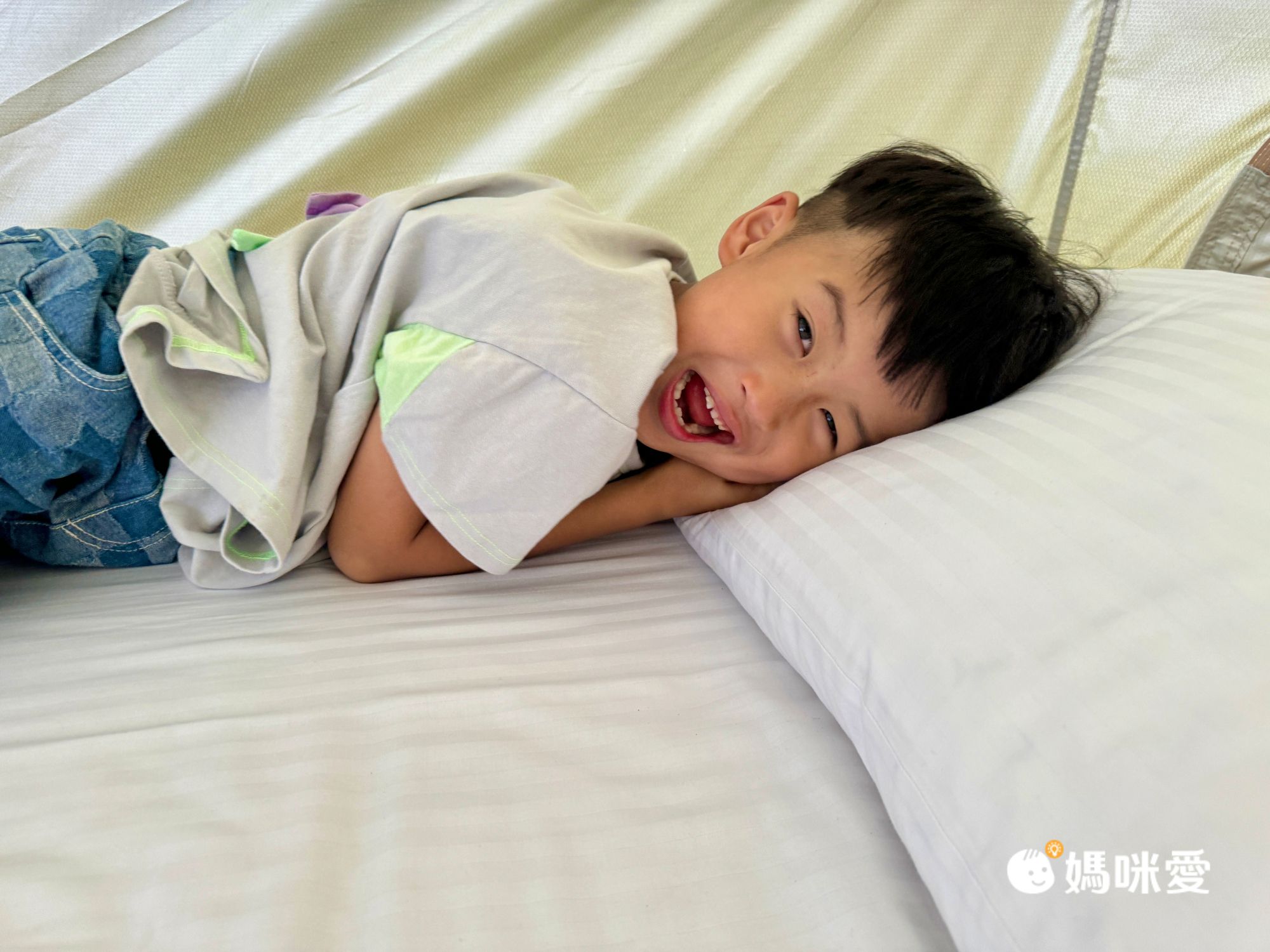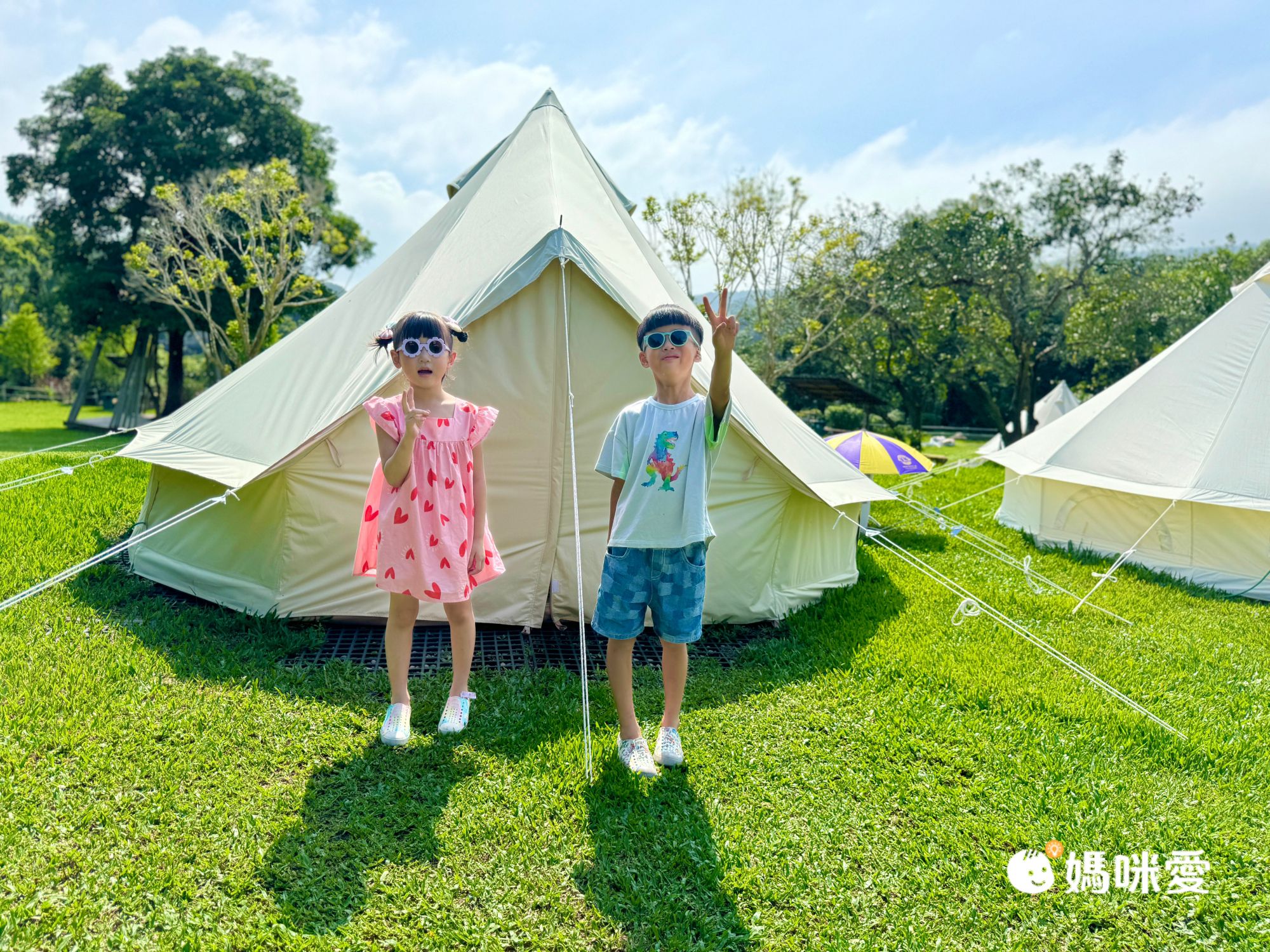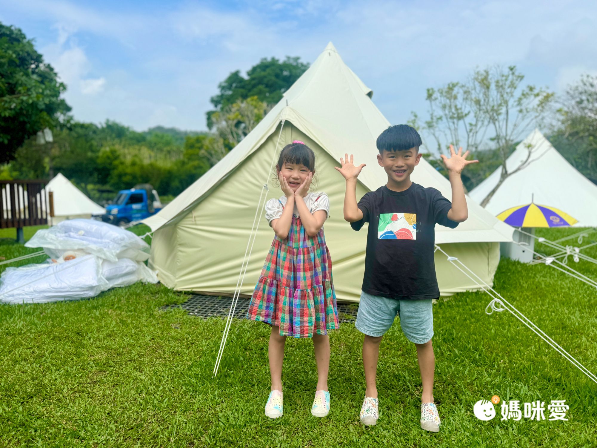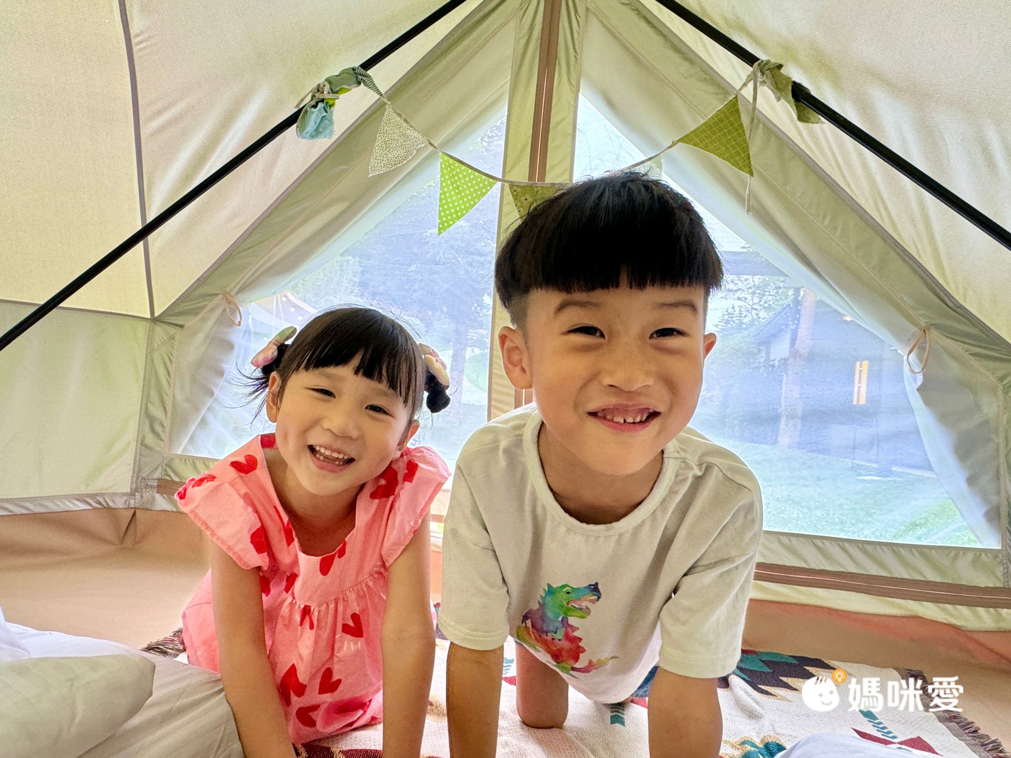 這是我們這次住的清新鐘型帳(適合3-4人)看看兄妹倆滿意的樣子!入住需自備:個人衣物、牙刷、牙膏、毛巾、拖鞋。