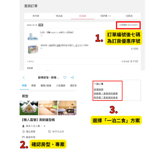 ※ 步驟2 待訂單完成付款,約1-3個工作天後,媽咪愛訂單將顯示「已出貨」,屆時表示優惠序號已開通,才可開始訂房喔。