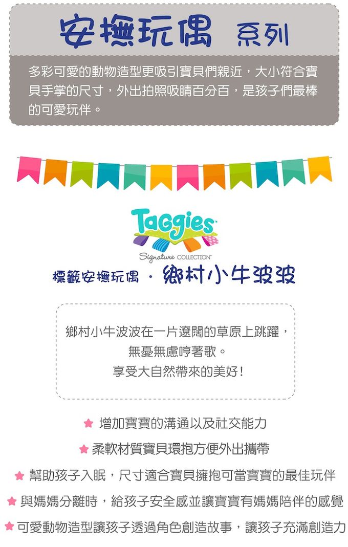 鄉村小牛波波在一片遼闊的草原上跳躍,無憂無慮哼著歌。享受大自然帶來的美好●柔軟的玩偶陪伴寶寶並給予安全感●許多彩色的緞帶標籤,提供觸感的刺激●活潑鮮豔的配色,及刺繡的眼睛和五官細節,吸引寶寶的注意力●安全柔軟布料,不傷害寶寶柔嫩肌膚
