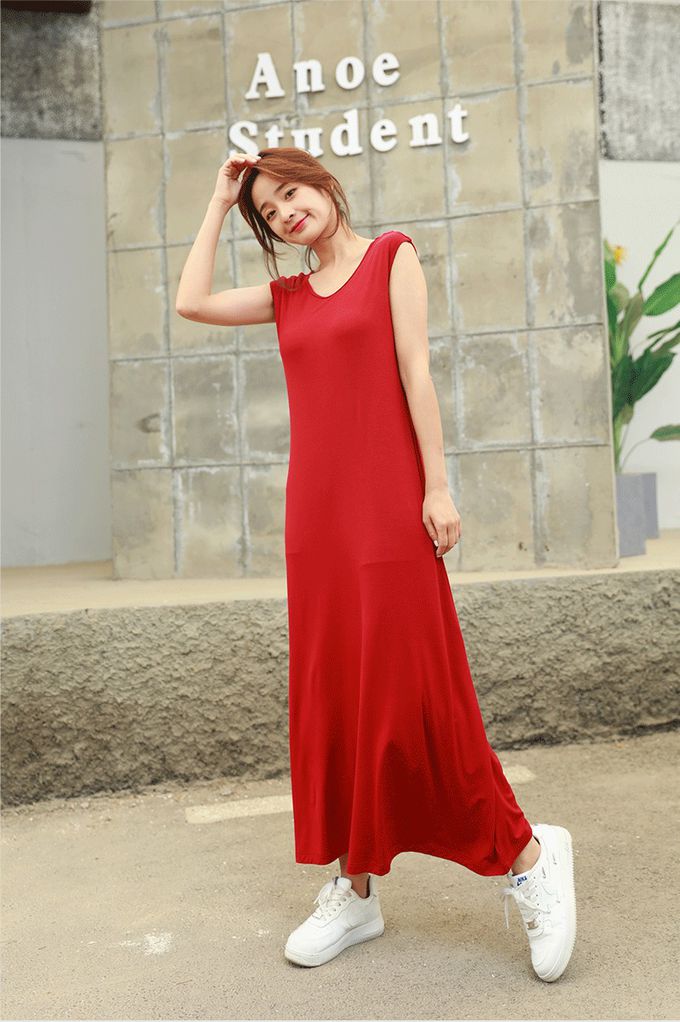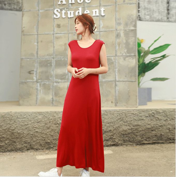 涼感莫代爾無袖Bra長洋裝-酒紅色