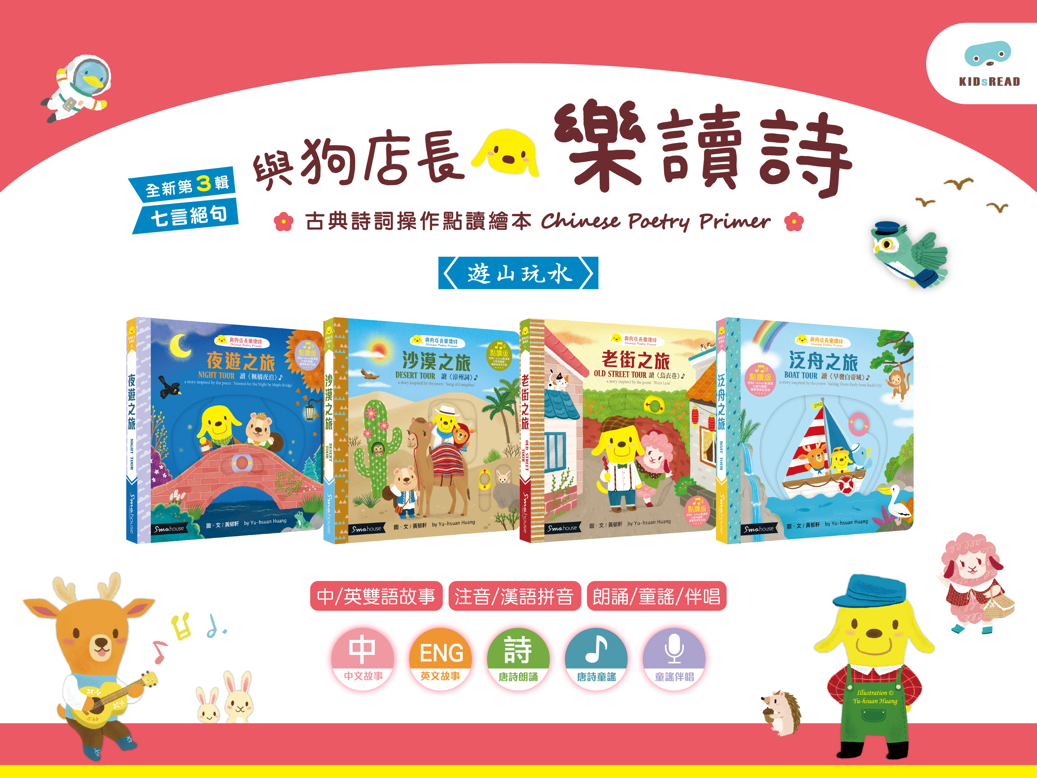 第三系列作品,遊山玩水,本次選題為唐詩中的七言絕句,讓已經熟悉前兩系列的小讀者,進一步接觸新的唐詩體裁。以旅遊為情境營造,帶入異國情調、山川夜景,引發小讀者探索生活圈外世界的動機。