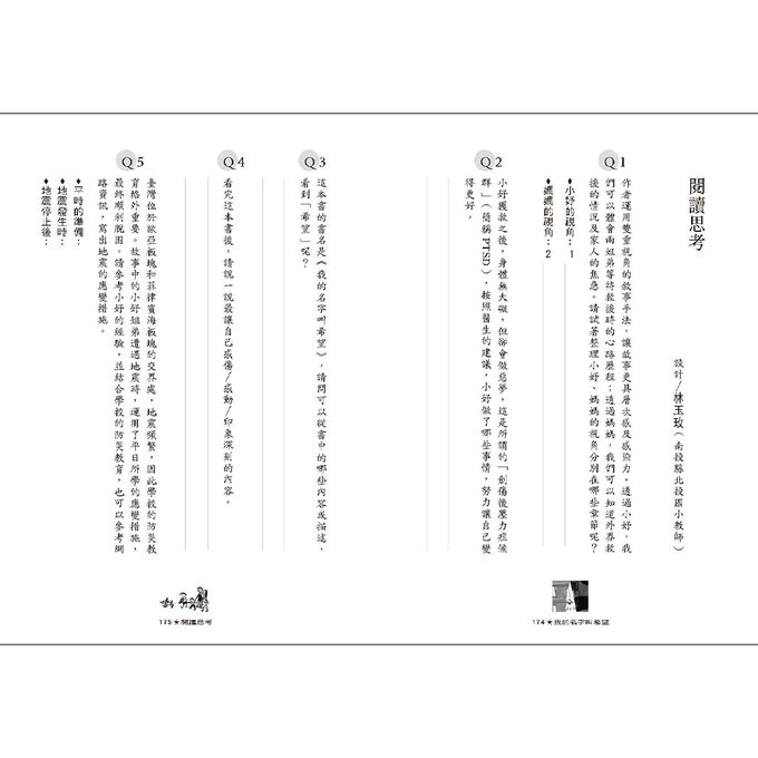 特別邀請南投縣北投國小林玉玫老師設計「延伸閱讀思考」單元,針對故事文本、地震教育設計提問,帶領讀者深入本書的內容核心。