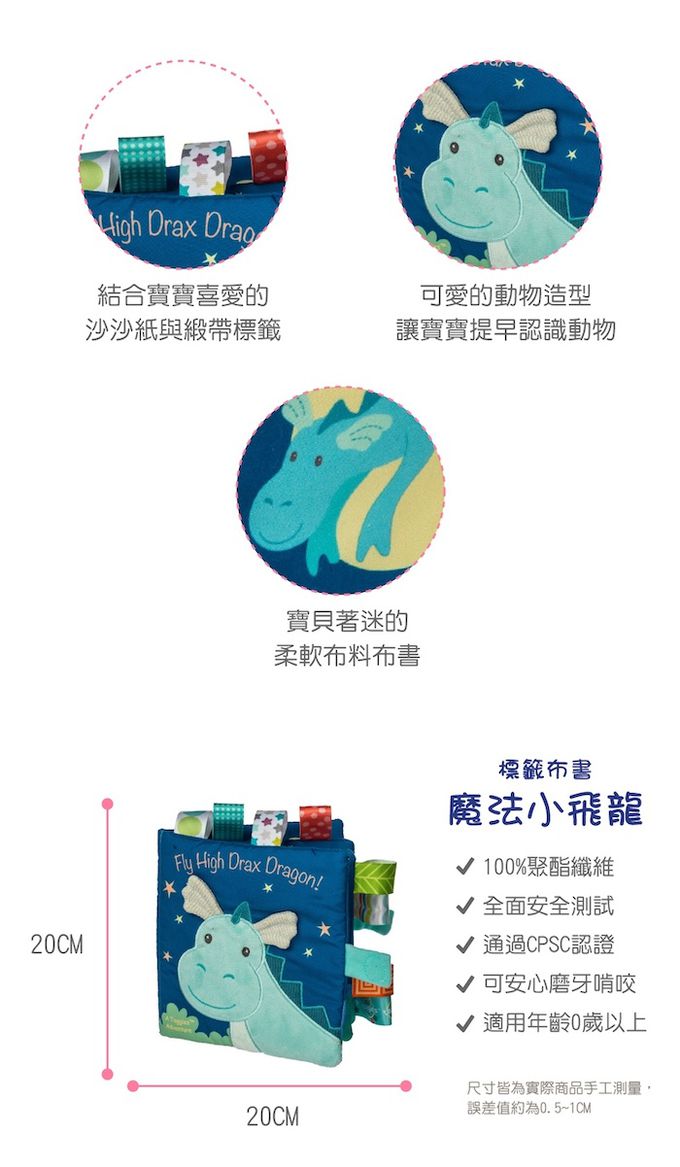 歡迎來到魔法世界,勇敢的魔法小飛龍,即將展開牠閃亮的翅膀,帶領孩子飛上天空體驗充滿魅力的景色●全柔軟布料的布書●為寶寶與媽咪帶來微笑的8頁小故事●結合寶寶喜愛的沙沙紙及緞帶標籤●搓揉會有喀擦喀擦的觸感跟聲音,吸引寶寶的注意力