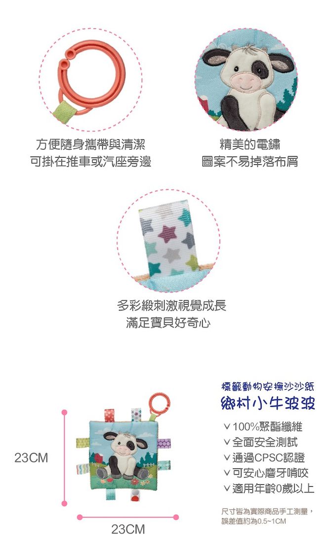 鄉村小牛波波在一片遼闊的草原上跳躍,無憂無慮哼著歌。享受大自然帶來的美好●靈活的拉環,可連接嬰兒車和嬰兒床●有趣可愛的角色圖案,吸引寶寶的好奇與喜愛●結合8個寶寶喜愛的緞帶標籤,提供觸感的刺激●搓揉會有喀擦喀擦的觸感跟聲音,按壓啾啾球會發出啾啾的聲音。刺激寶寶的聽力和訓練小手肌肉