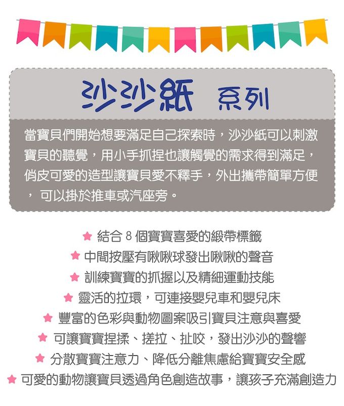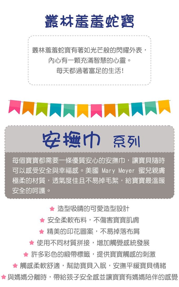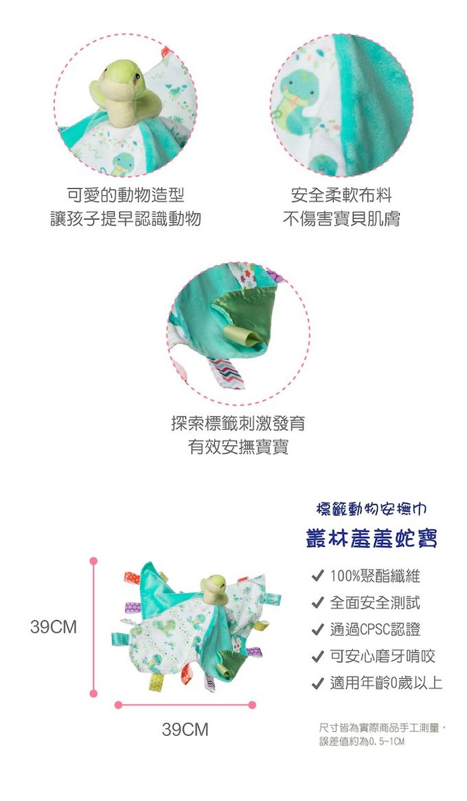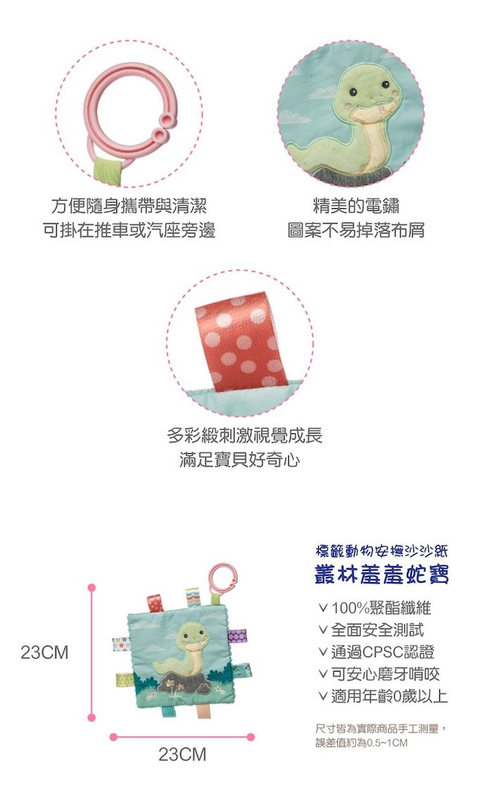 叢林羞羞蛇寶有著如光芒般的閃耀外表,內心有一顆充滿智慧的心靈。每天都過著富足的生活●觸感柔軟且帶給寶寶安全感,陪伴寶寶勇敢自行入睡●探索標籤提供寶寶觸感的刺激●沙沙紙上靈活的拉環,可連接嬰兒車和嬰兒床●搓揉沙沙紙會有喀擦喀擦的觸感跟聲音,按壓啾啾球會發出啾啾的聲音●不同的布料刺激觸覺,有效的安撫寶寶