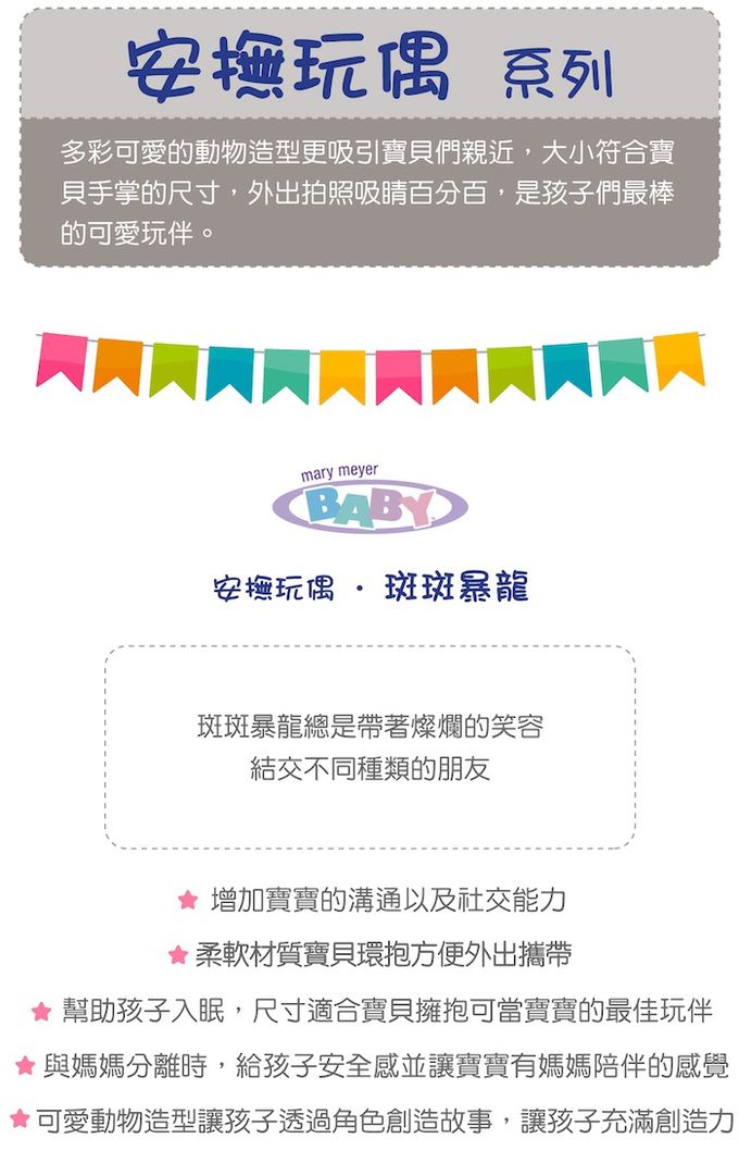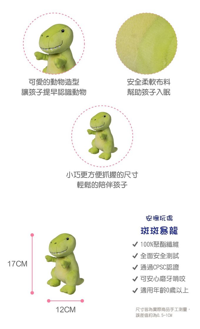 斑斑暴龍總是帶著燦爛的笑容,結交不同種類的朋友●柔軟的玩偶陪伴寶寶並給予安全感●活潑鮮豔的配色,及刺繡的眼睛和五官細節,吸引寶寶的注意力●安全柔軟布料,不傷害寶寶柔嫩肌膚●適合小手的尺寸易抓握,讓寶寶輕鬆訓練小手的肌肉