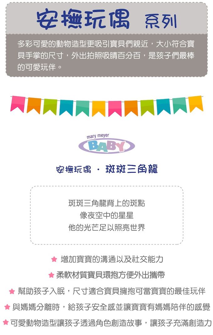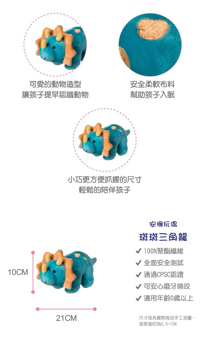 斑斑三角龍背上的斑點,像夜空中的星星,他的光芒足以照亮世界●柔軟的玩偶陪伴寶寶並給予安全感●活潑鮮豔的配色,及刺繡的眼睛和五官細節,吸引寶寶的注意力●安全柔軟布料,不傷害寶寶柔嫩肌膚●適合小手的尺寸易抓握,讓寶寶輕鬆訓練小手的肌肉
