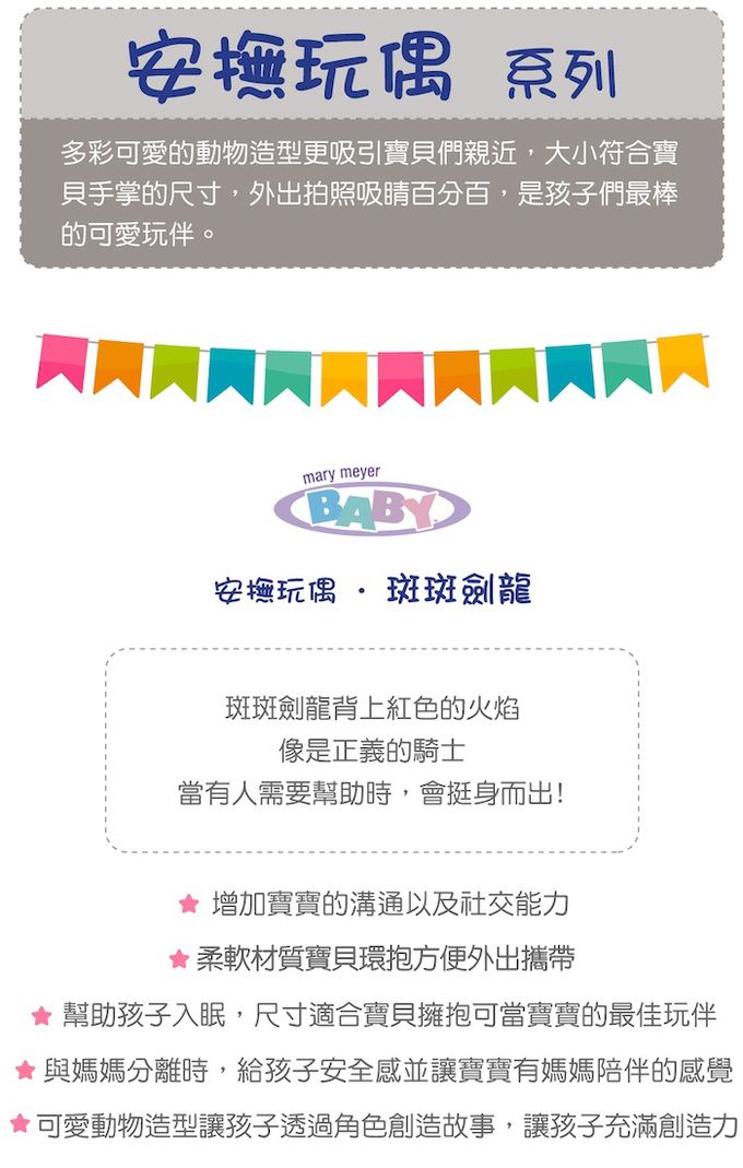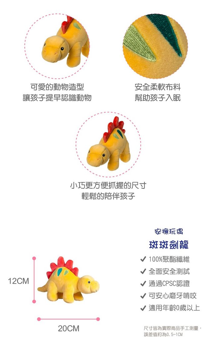 斑斑劍龍背上紅色的火焰,像是正義的騎士。當有人需要幫助時,會挺身而出●柔軟的玩偶陪伴寶寶並給予安全感●活潑鮮豔的配色,及刺繡的眼睛和五官細節,吸引寶寶的注意力●安全柔軟布料,不傷害寶寶柔嫩肌膚●適合小手的尺寸易抓握,讓寶寶輕鬆訓練小手的肌肉