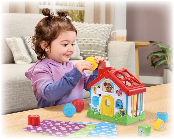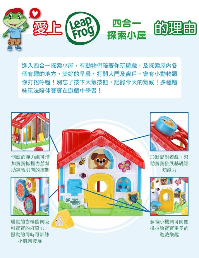 ●打開大門及窗戶,會有小動物跟你打招呼。打開信箱收信、轉動天氣開關、旋轉每個齒輪,都能訓練手部小肌肉●在彈力帶之間伸手放置或取回不同的物品,提高手指靈活性。也能撥動彈力帶增添更多樂趣●四種不同形狀的積木,住著可愛動物們。將積木配對於屋頂上正確的形狀槽。認識形狀及配對技巧●三個不同顏色的數字球,投入煙囪內。讓小屋內更加熱鬧。一起數到三,把可愛的雲朵紙巾從煙囪內拉出來,增加玩樂的刺激感●四合一探索小屋使用85%回收材料製作而成●多元學習主題-形狀/顏色/數字/配對/手部肌肉/手眼協調