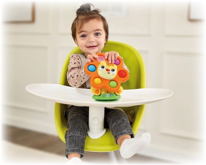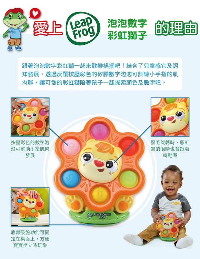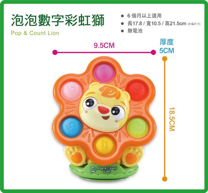 ●1-6不同顏色的數字泡泡,矽膠材質好按壓且不傷害肌膚●按壓泡泡數字,可以練習數數、認識顏色。且按壓後再回壓回來,訓練手部小肌肉及手眼協調●橘色圓盤可自行旋轉,彩虹獅的眼睛也會跟著轉動。與孩子一起歡樂互動●方便攜帶且底部附有吸盤功能,可吸附在桌上不易掉落。適合寶寶坐立時玩樂●多元學習主題-顏色/數字/手部肌肉/手眼協調
