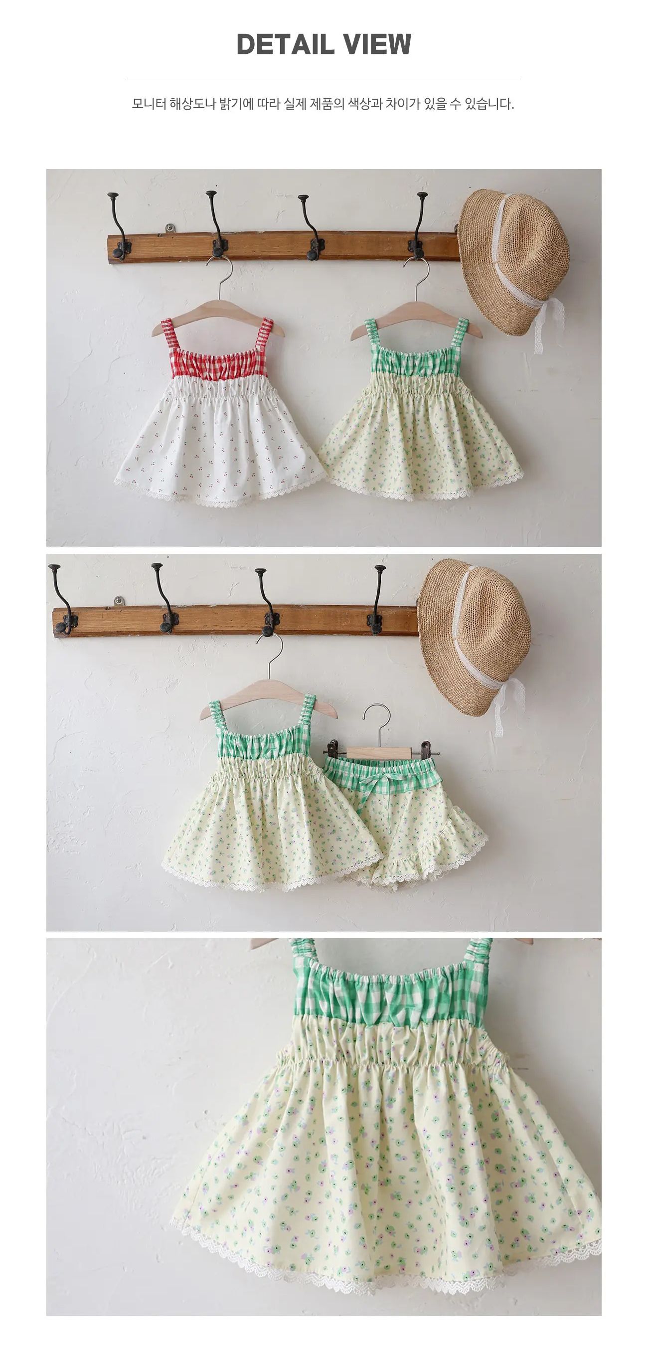 韓國 PuellaFLO - 甜心格紋拼接彈性細肩帶上衣-小花彩-淡黃X綠