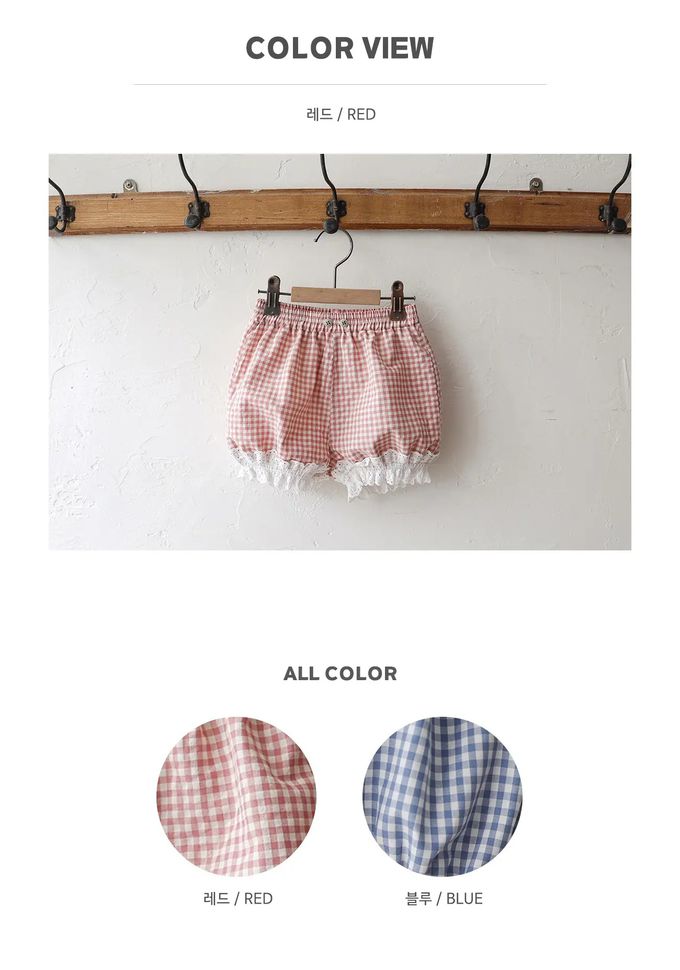 韓國 PuellaFLO - 鬆緊腰甜甜格紋蕾絲裝飾短褲-紅