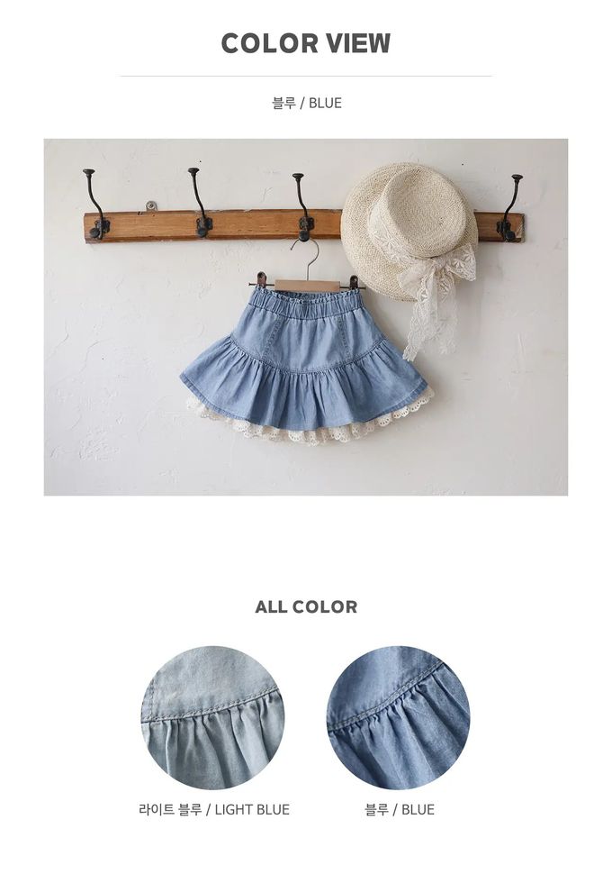 韓國 PuellaFLO - 鬆緊腰層次蕾絲丹寧褲裙-中青
