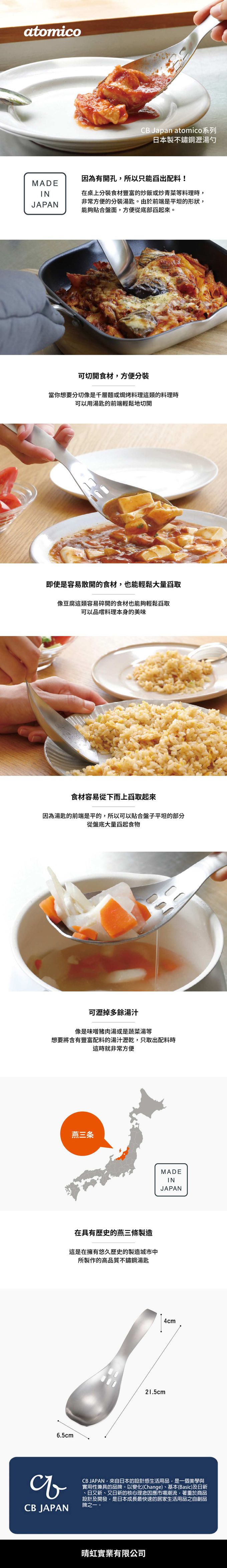 日本製有洞孔設計的不鏽鋼瀝湯勺,可以瀝掉多餘湯汁只取出配料,前端平面設計還可以用來分切料理(如:義大利千層麵),就連容易散碎的豆腐食材也可以輕鬆舀取,可讓您一次品嚐料理本身的美味。