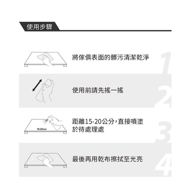 使用方式:1.使用前請先搖一搖。 2.距離10-15公分處少量噴塗於物品表面,再用乾布擦拭均勻。 3.或直接噴塗於乾布上,再均勻擦拭於物品表面即可。 使用於不明確材質表面時,請先噴於乾布上,在不顯眼處小範圍試用,確認無退色或損害後,再大範圍使用。