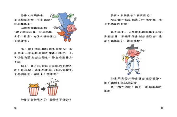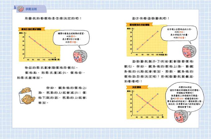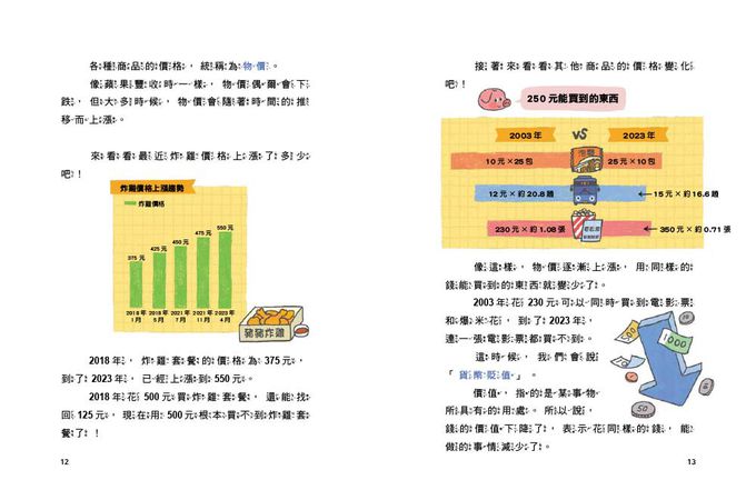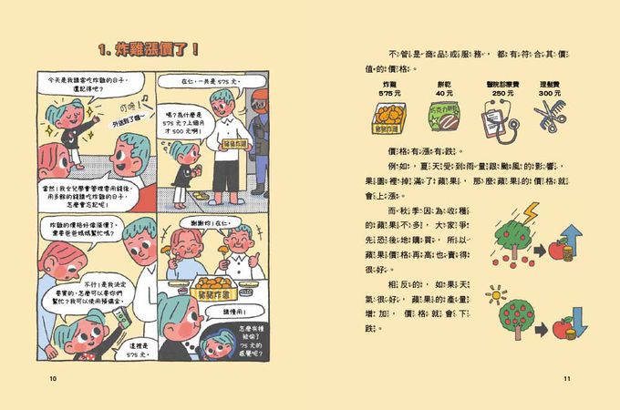 例如在「炸雞漲價了!」主題中,在仁要請爸媽請炸雞,但卻發現炸雞竟然比上個月價錢還貴了許多,進而帶出「貨幣貶值」的概念,並說明不管是商品或服務,都有符合其價值的價格,而且價格有漲有跌。例如,夏天受到雨量跟颱風的影響,果園裡掉滿了蘋果,那麼蘋果的價格就會上漲;而秋季因為蘋果產量不多,大家爭先恐後地購買,所以蘋果價格再高也賣得很好。相反的,如果天氣很好,蘋果的產量增加,價格就會下跌。單元最後,更輔以圖表,來講解「物價波動」和「供需法則」之經濟概念。
