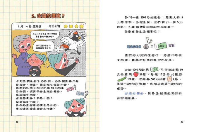 這次內容包含:「炸雞漲價了!」、「金錢的價值?」、「我要買股票」、「企業如何賺錢?」、「要繳稅嗎?」……等15個主題,透過漫畫圖文+日記形式的情境引導,以生活中會發生的實例,讓孩子了解什麼是「經濟」。