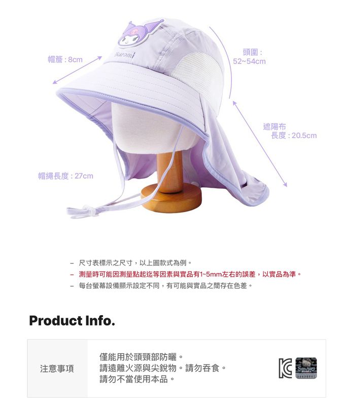 韓國配件連線 - 卡通造型大帽簷網眼防曬遮脖帽-卡通人物庫洛米-淡紫 (頭圍約52~54cm)