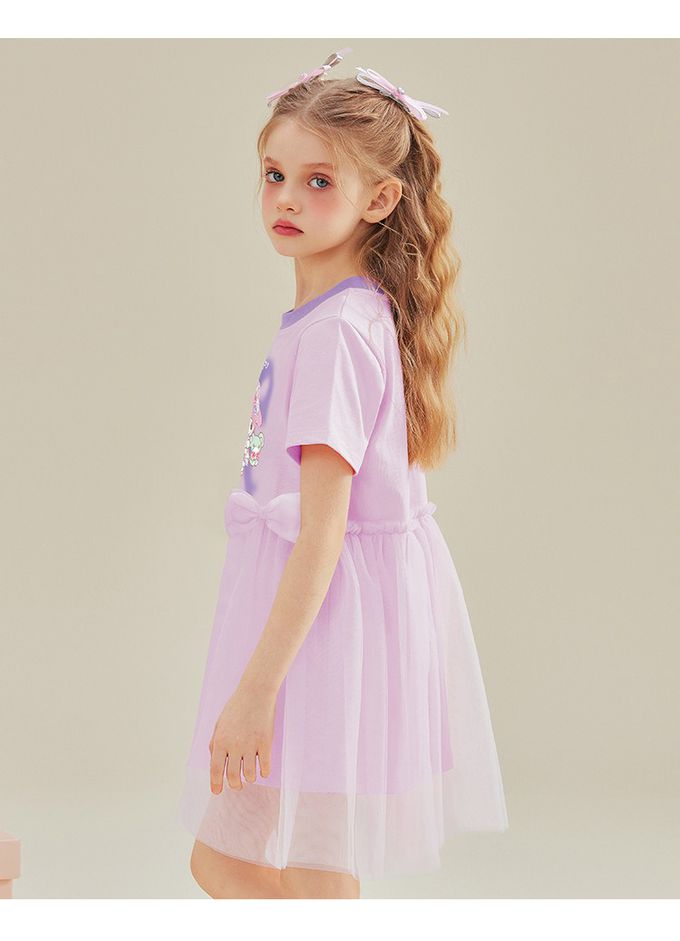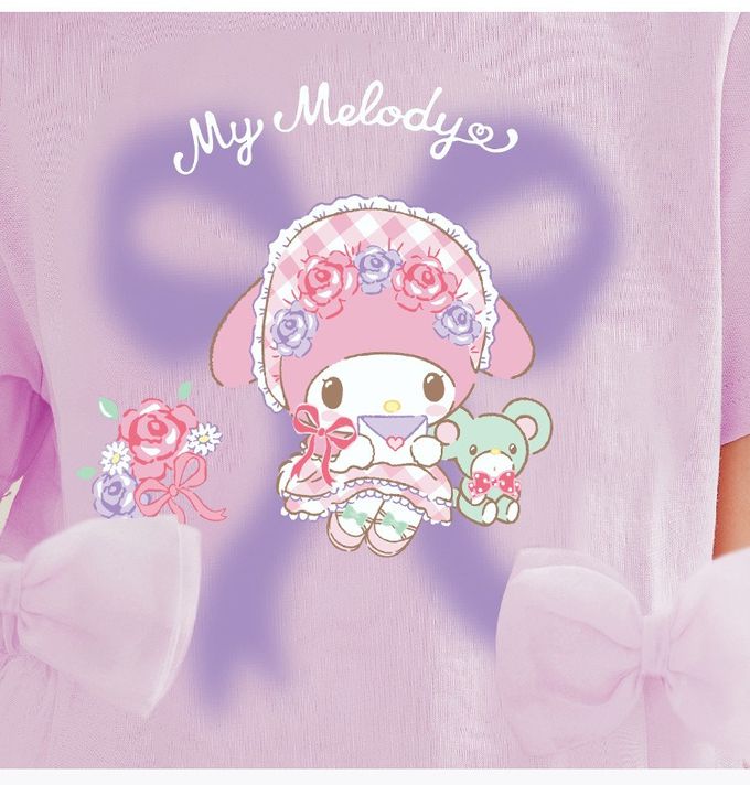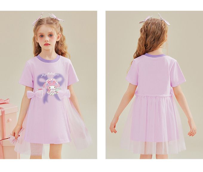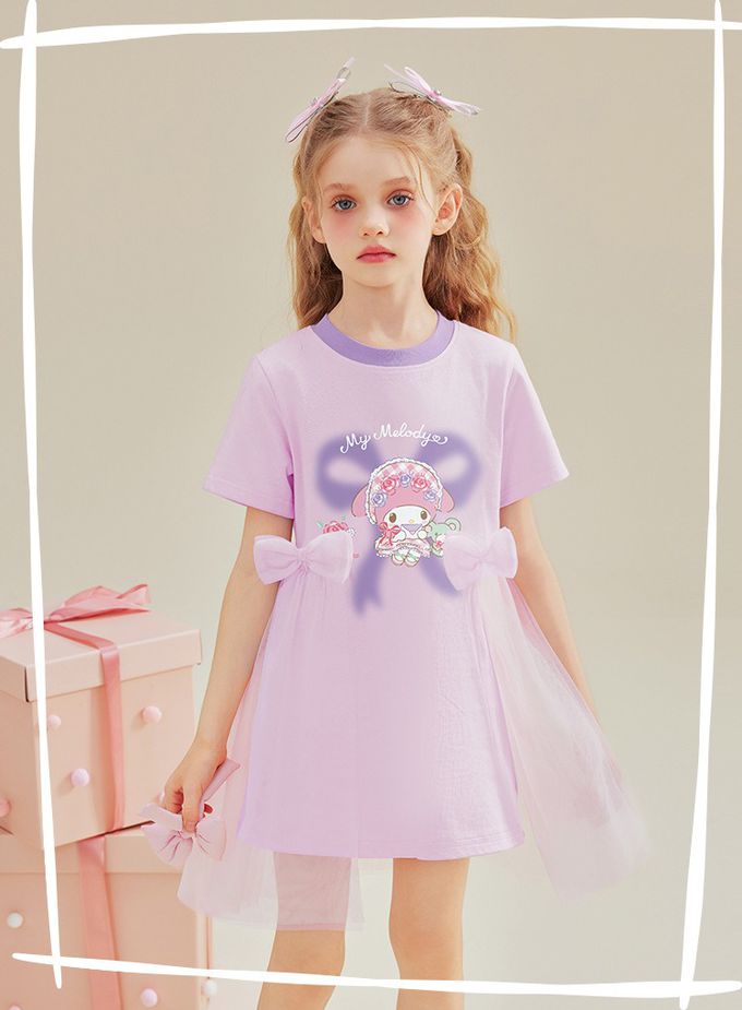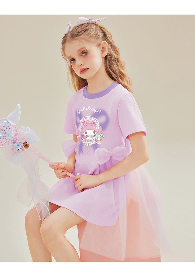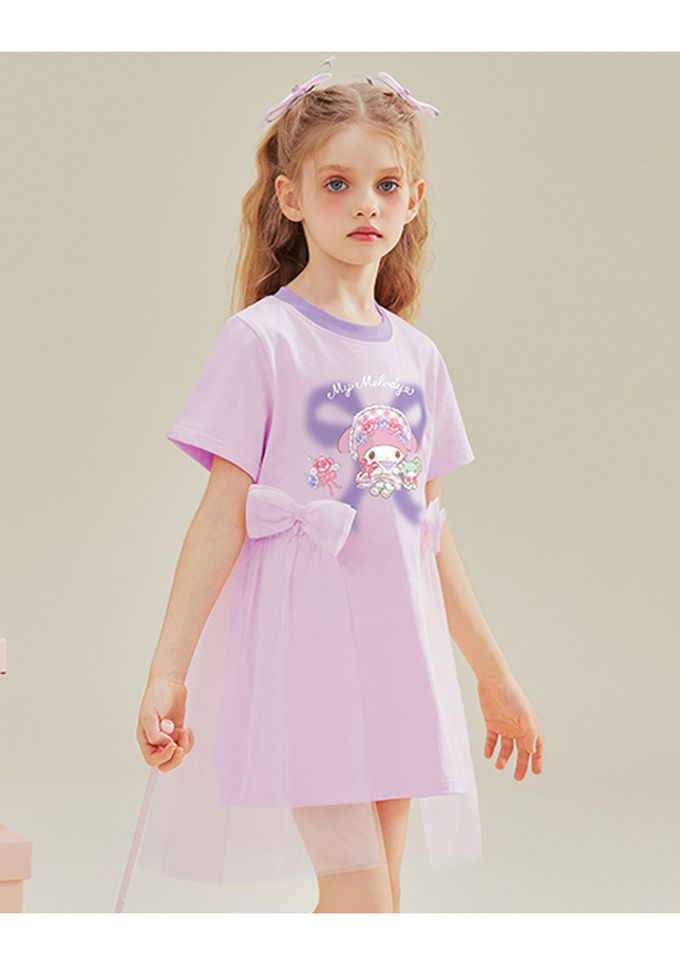 蝴蝶結網紗拼接短袖洋裝-卡通人物美樂蒂-紫色