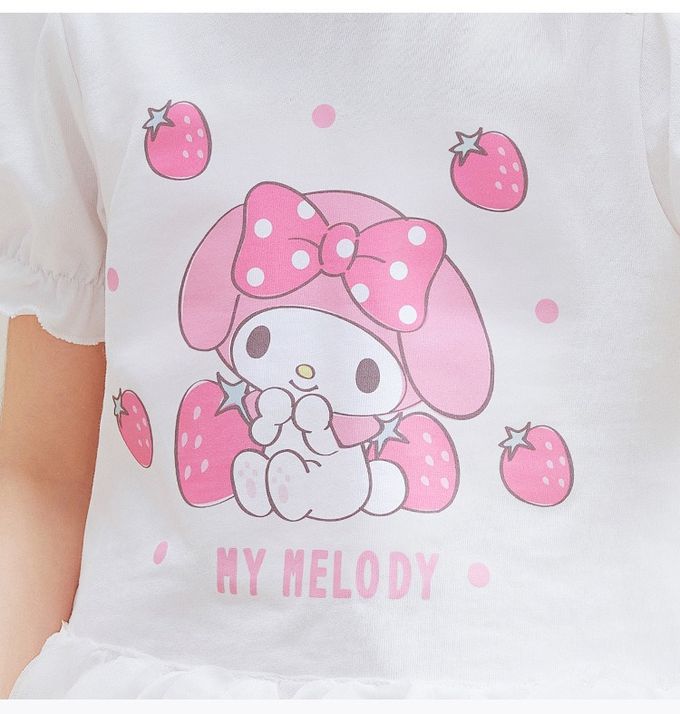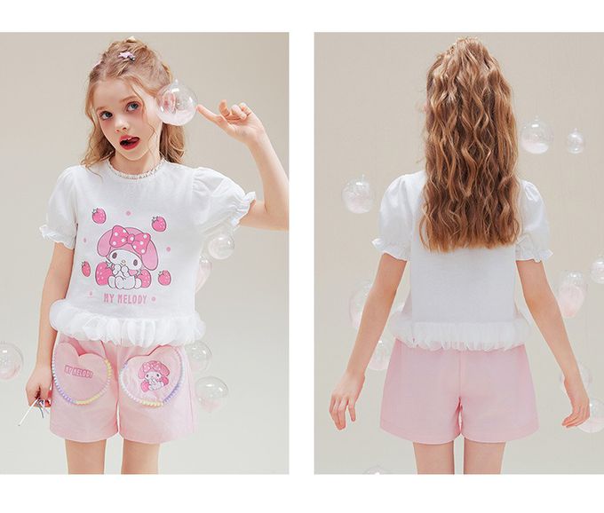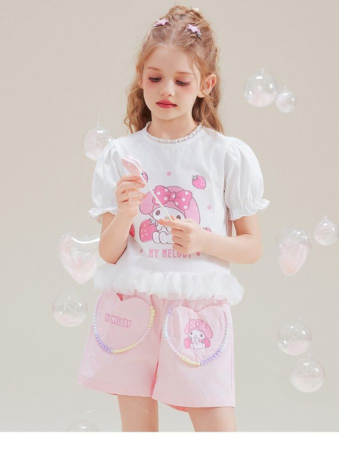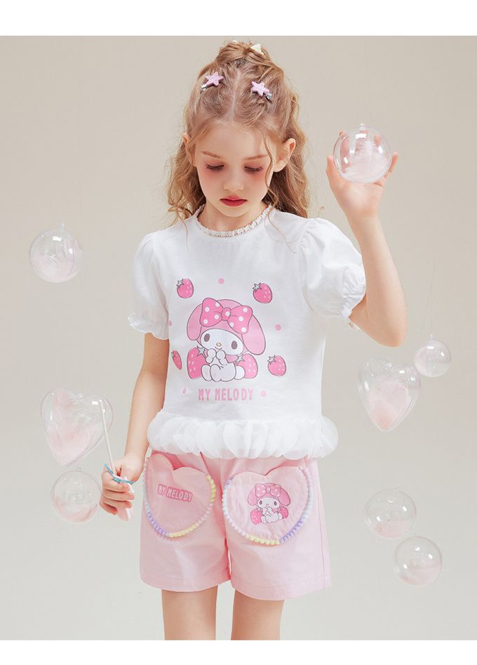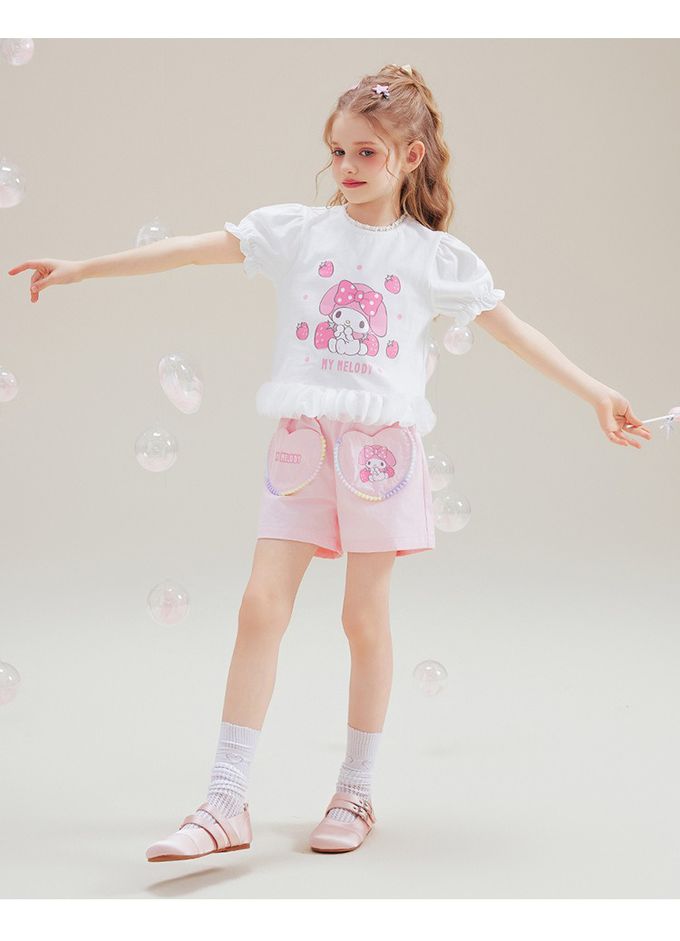 純棉法式泡泡短袖上衣+短褲套裝-卡通人物美樂蒂-白色