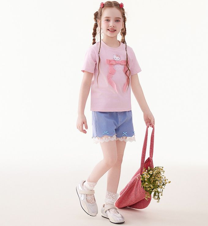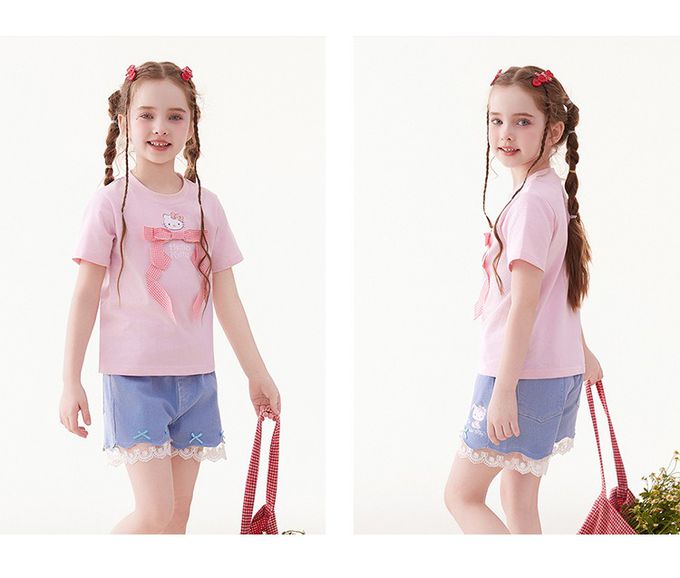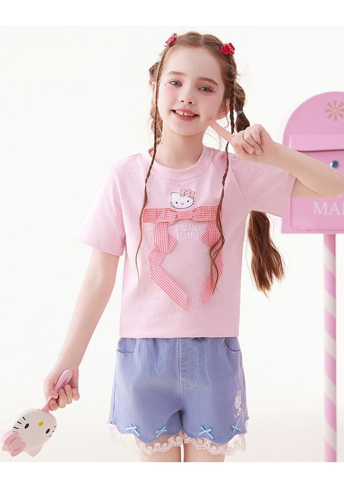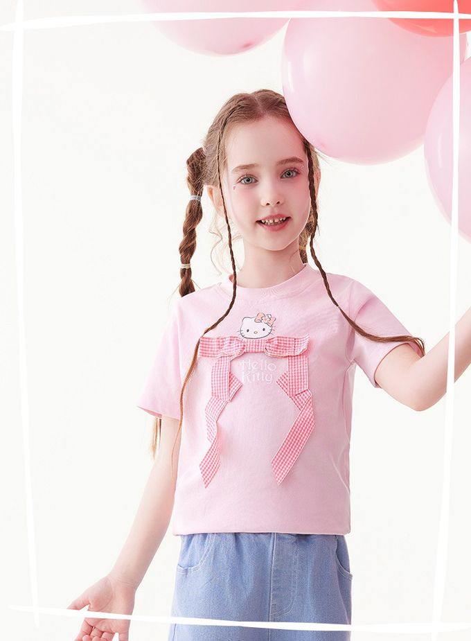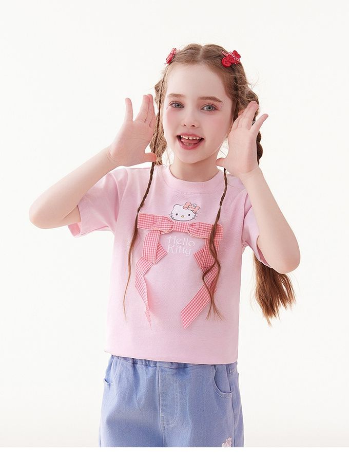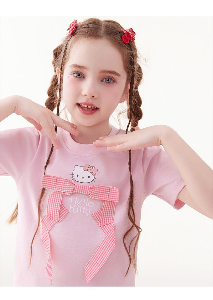 人氣卡通 - 純棉圓領蝴蝶結短袖上衣-卡通人物Hello Kitty-粉色