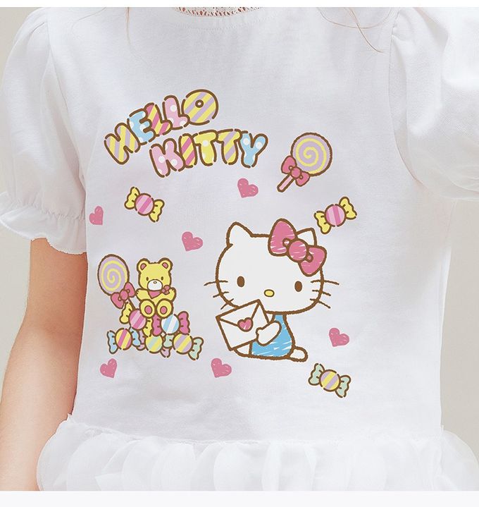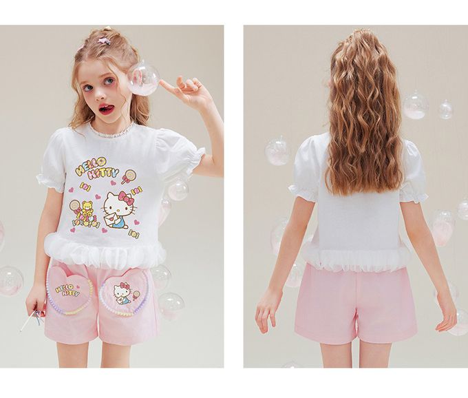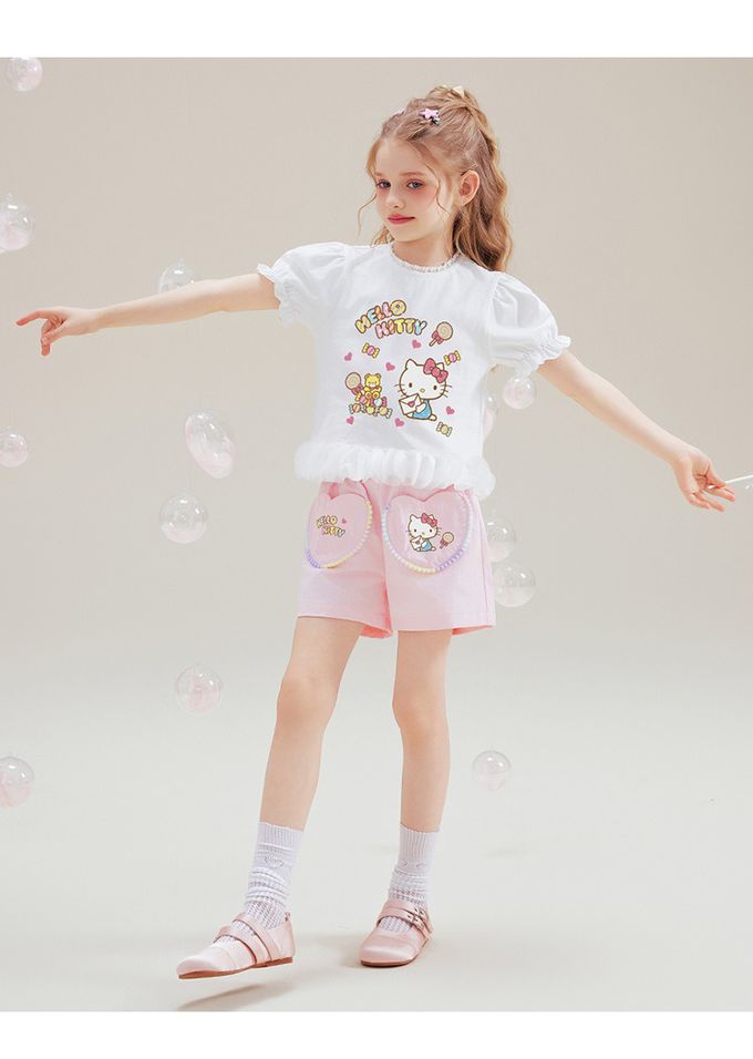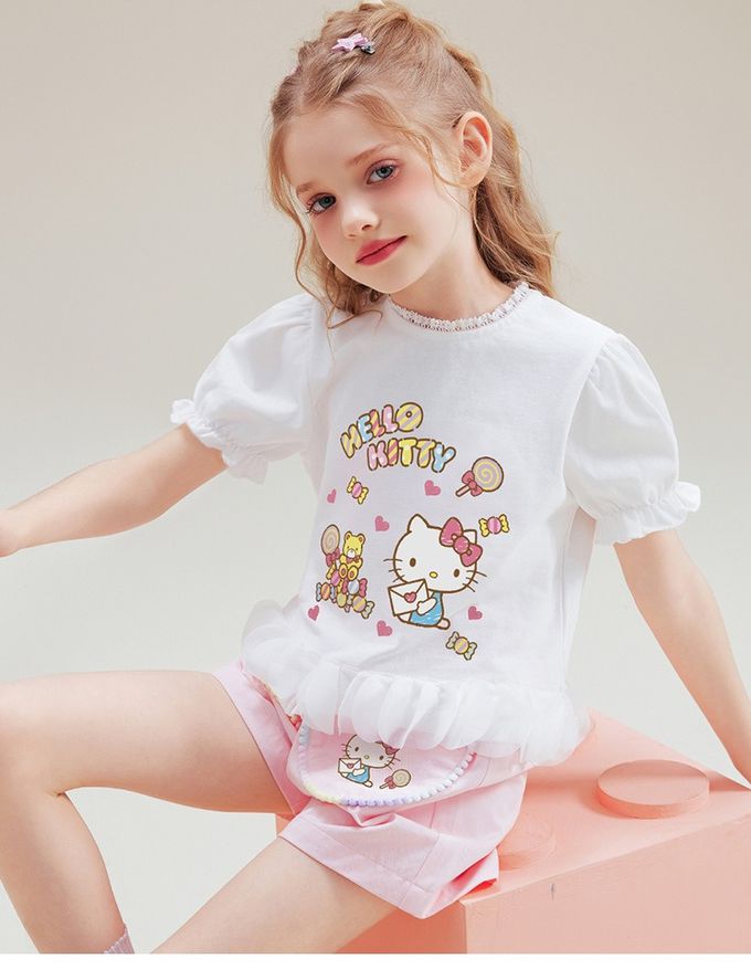純棉法式泡泡短袖上衣+短褲套裝-卡通人物Hello Kitty-白色