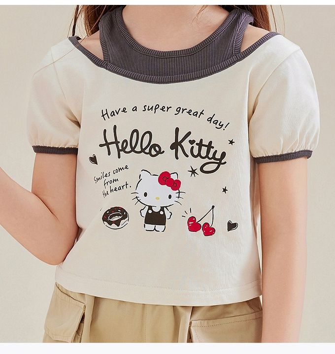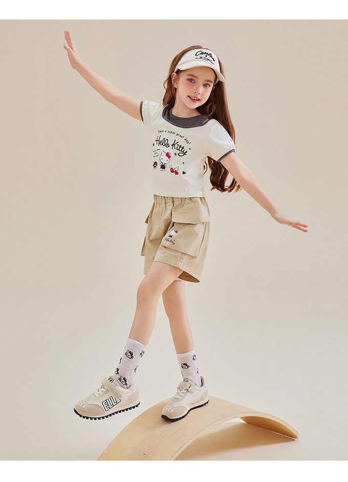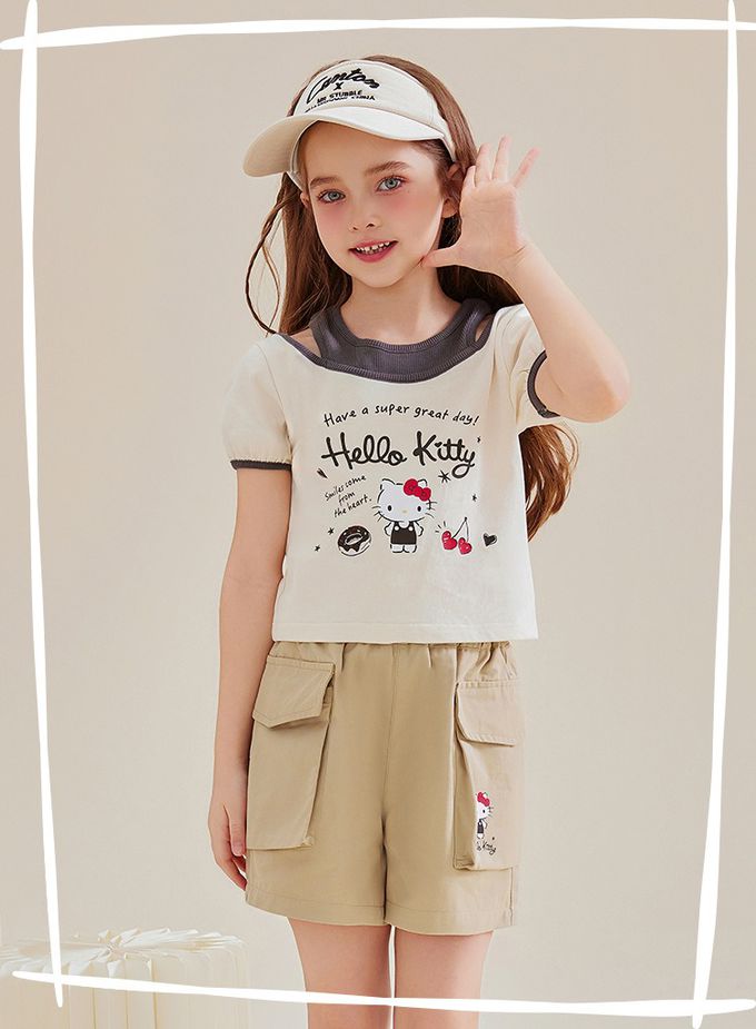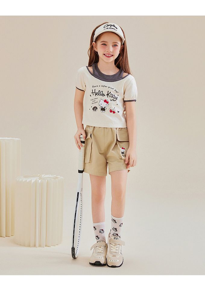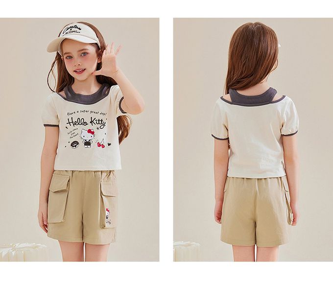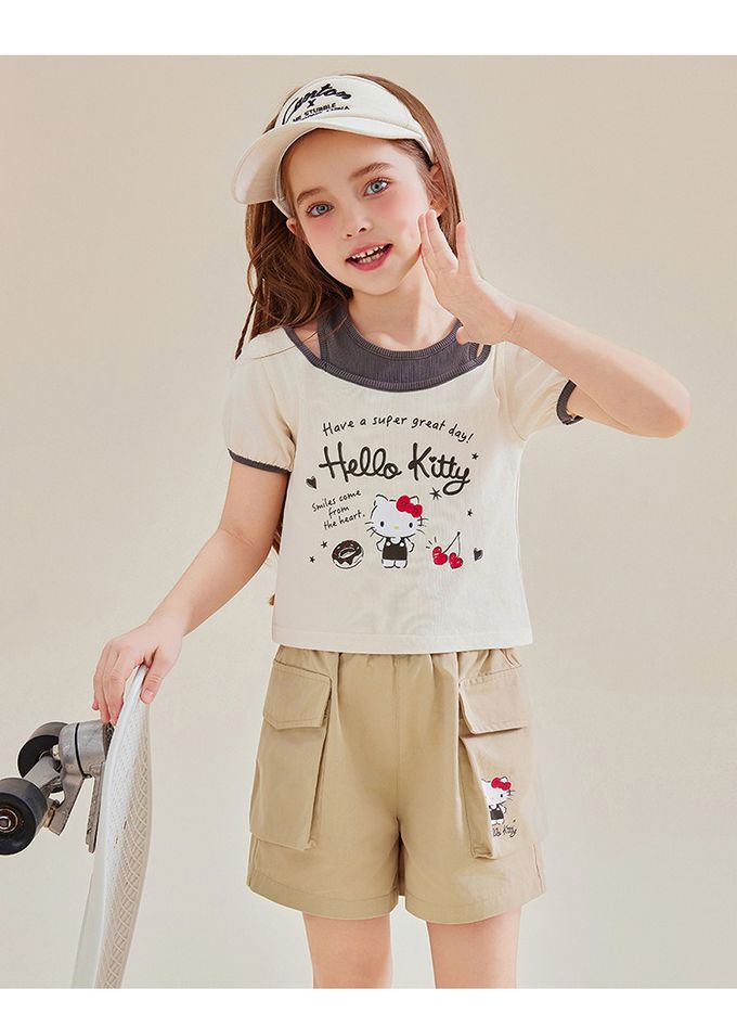 人氣卡通 - 假兩件工裝風上衣+短褲套裝-卡通人物Hello Kitty-卡其色