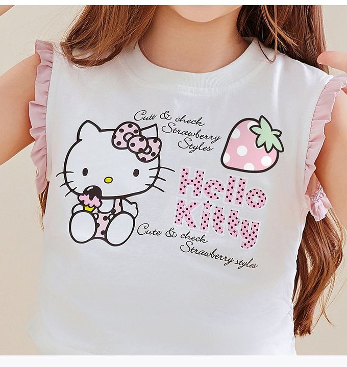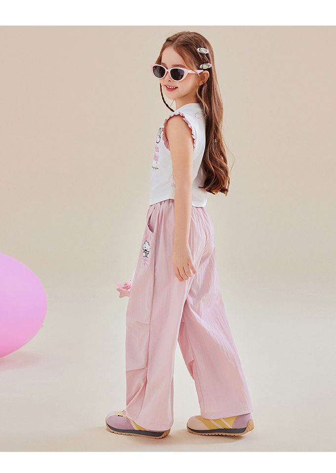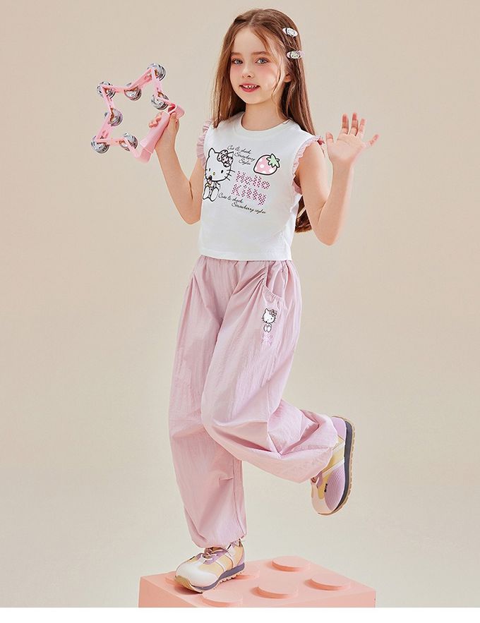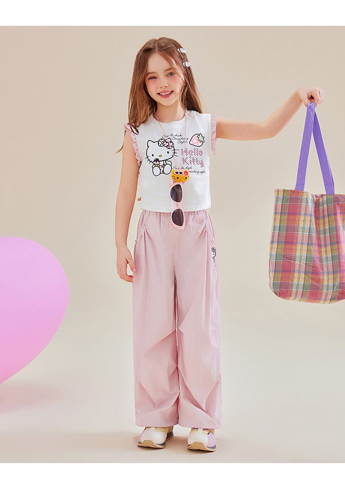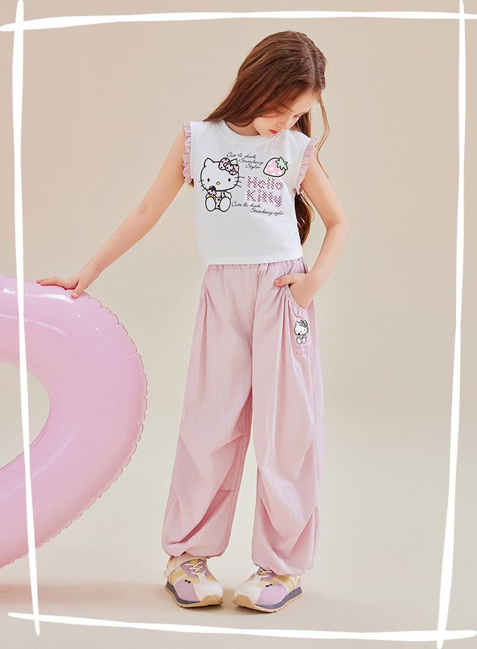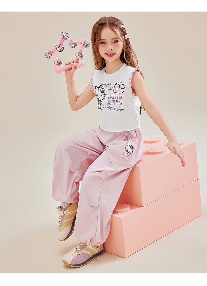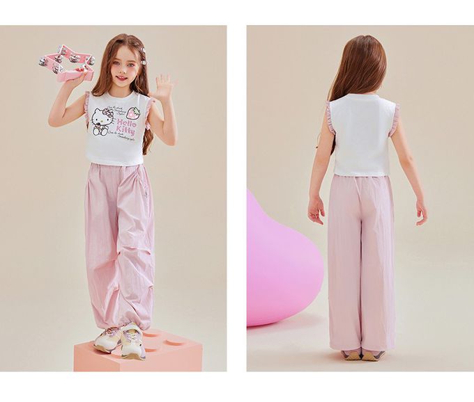 人氣卡通 - 撞色荷葉邊無袖上衣+長褲套裝-卡通人物Hello Kitty-粉色