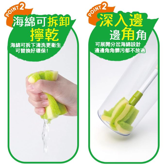 【使用方法】※請對照參考包裝圖示。●刷柄伸縮時請按壓按鈕邊滑動於想要的方向,把按鈕固定於孔中即可。●裝置替換海綿時把刷柄滑入海棉底部直到聽到「喀」一聲 。●拆卸海綿時請握住刷柄最前端拉取下。