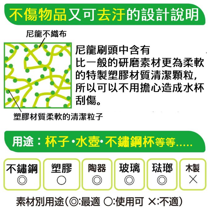 【用途】可清洗不鏽鋼、塑膠、陶器、玻璃、琺瑯材質等杯子、水壺等清潔。※不適合用於木製物品。