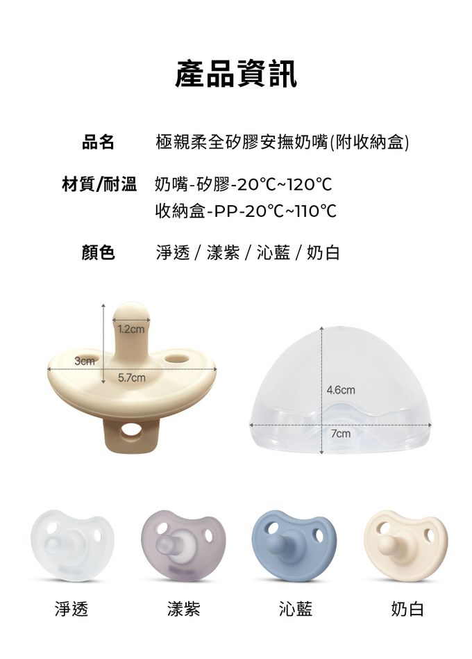 品名:極親柔全矽膠安撫奶嘴(附收納盒)