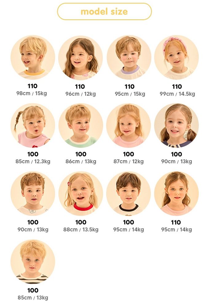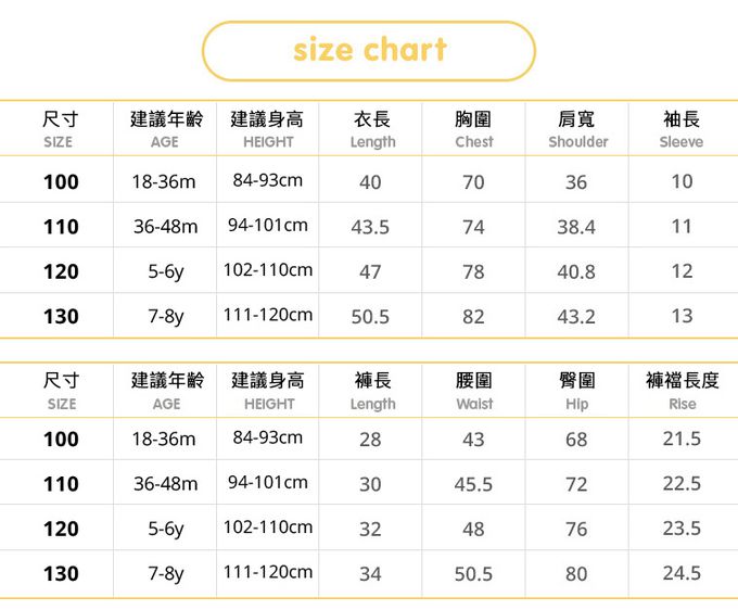 1. 尺寸表單位皆為公分(cm),實際尺寸會因布料彈性、水洗、測量起迄點等因素略有誤差。建議參考孩子平時穿著衣物尺寸進行選購。