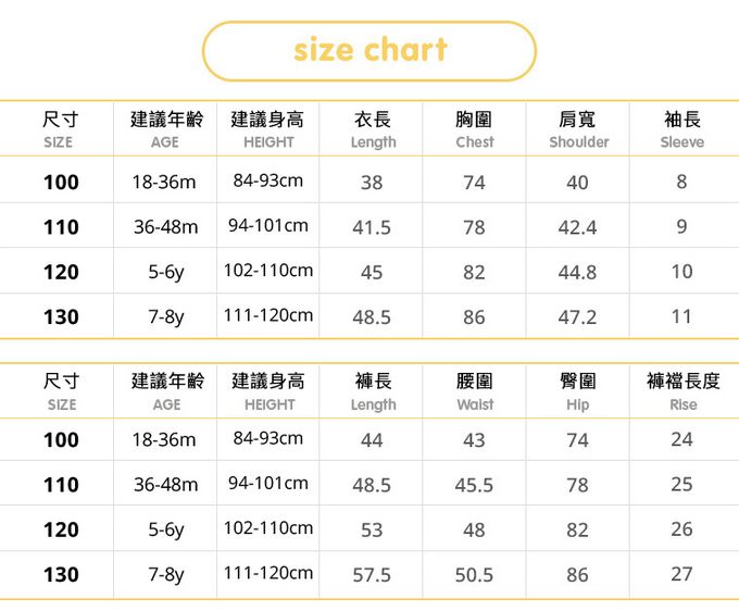 1. 尺寸表單位皆為公分(cm),實際尺寸會因布料彈性、水洗、測量起迄點等因素略有誤差。建議參考孩子平時穿著衣物尺寸進行選購。