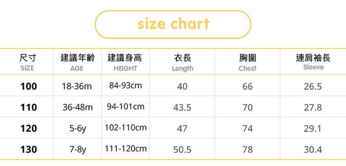 1. 尺寸表單位皆為公分(cm),實際尺寸會因布料彈性、水洗、測量起迄點等因素略有誤差。建議參考孩子平時穿著衣物尺寸進行選購。