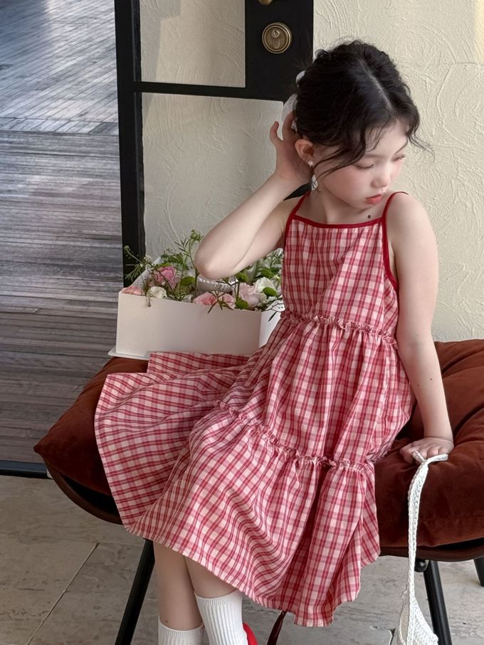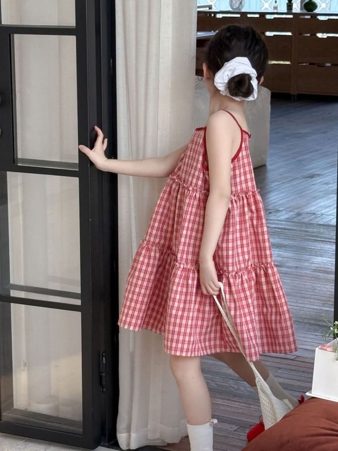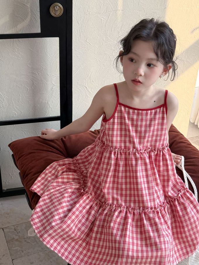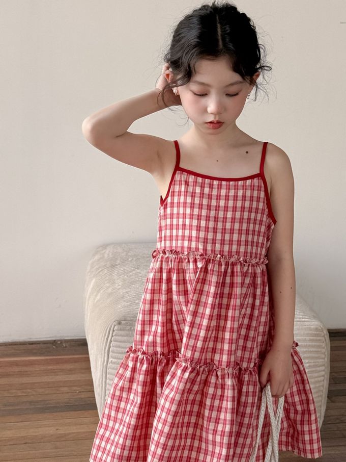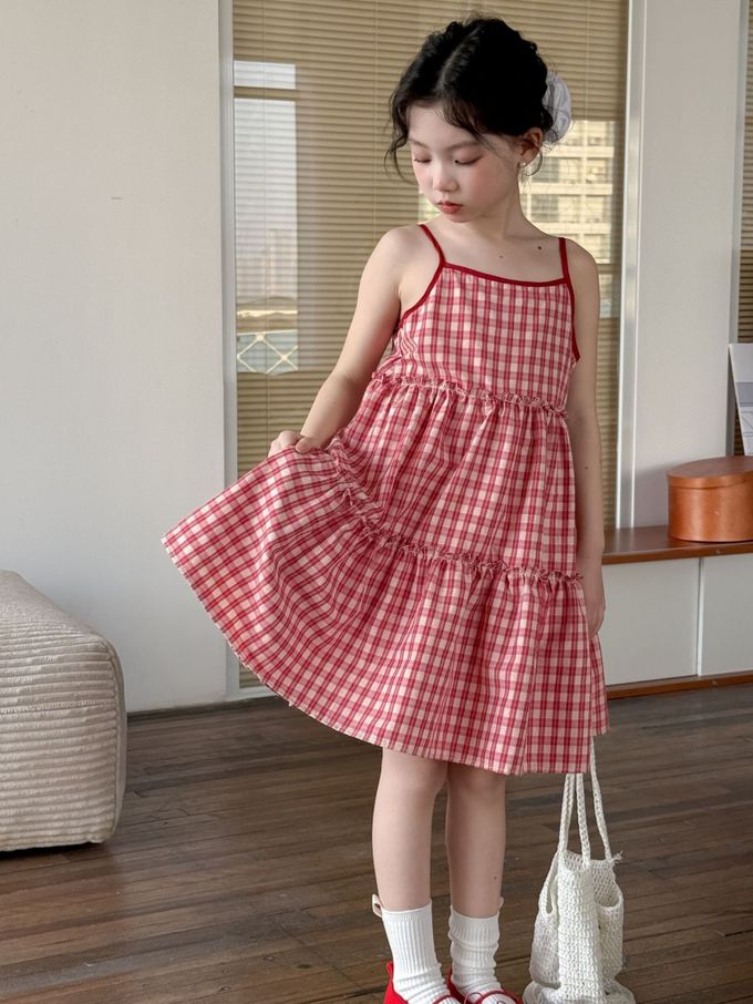 Wawama - 細肩帶蛋糕裙/洋裝-荷葉邊-紅白格子