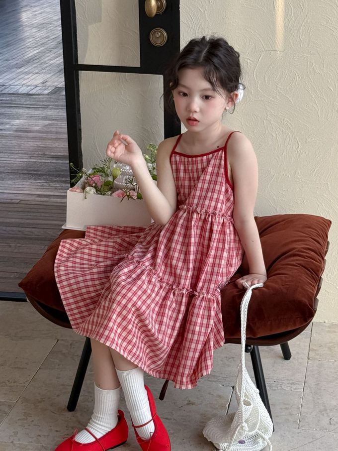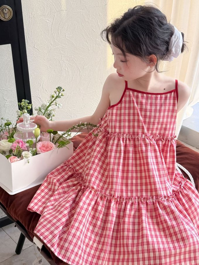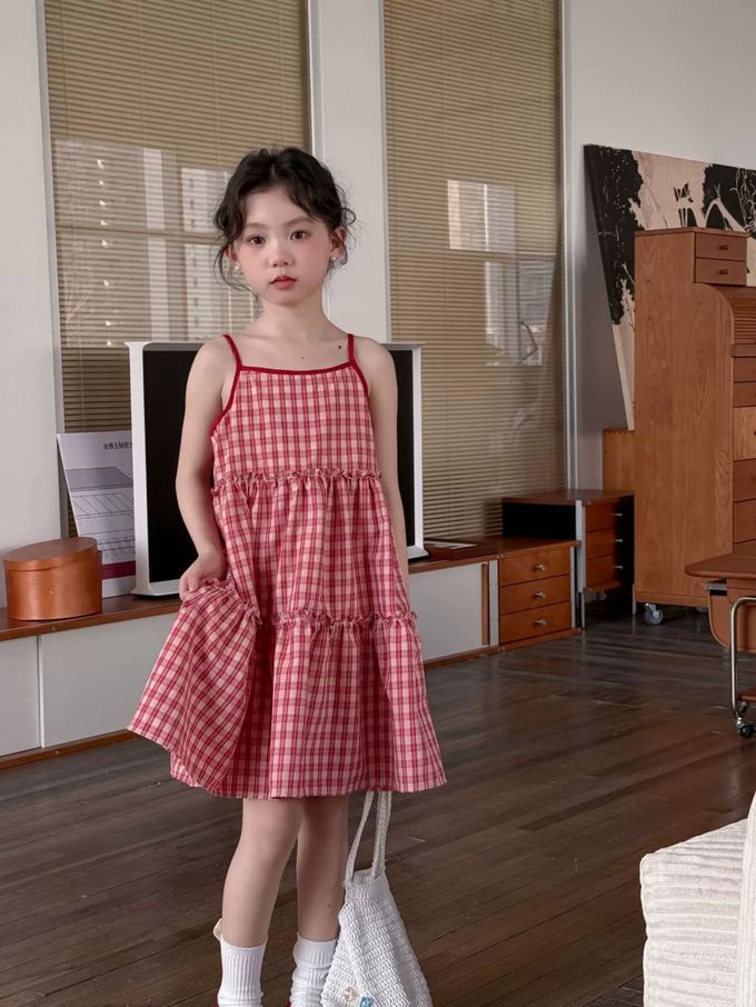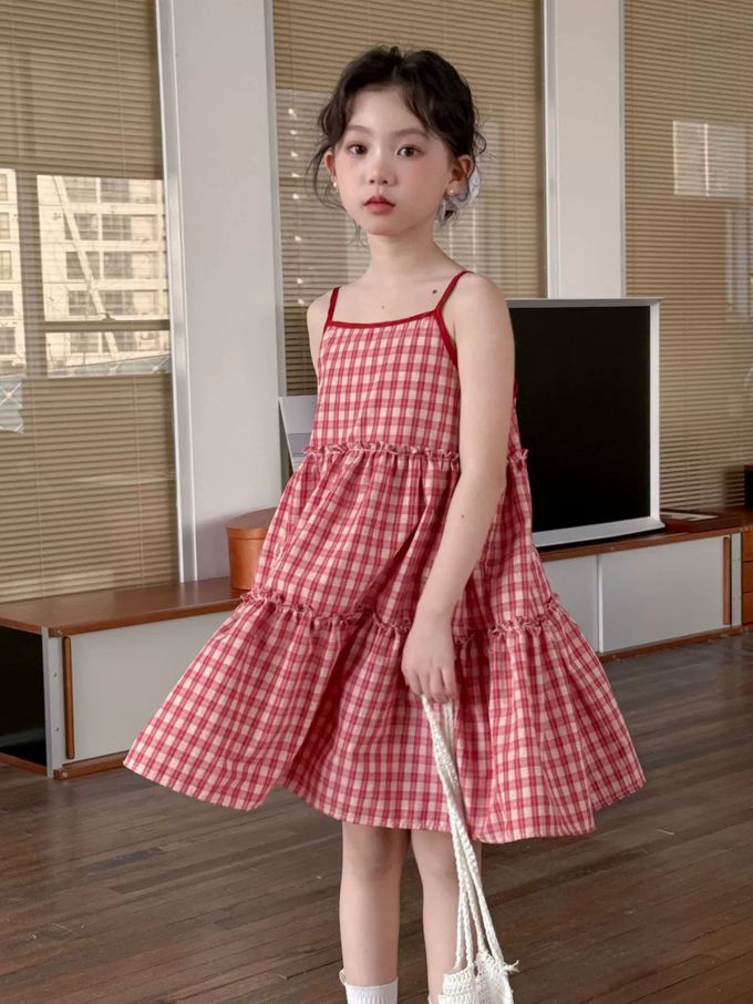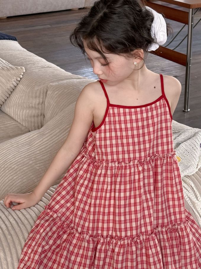 Wawama - 細肩帶蛋糕裙/洋裝-荷葉邊-紅白格子
