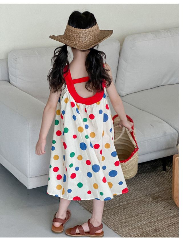 Wawama - 撞色露背無袖中長版洋裝-彩色點點-米白