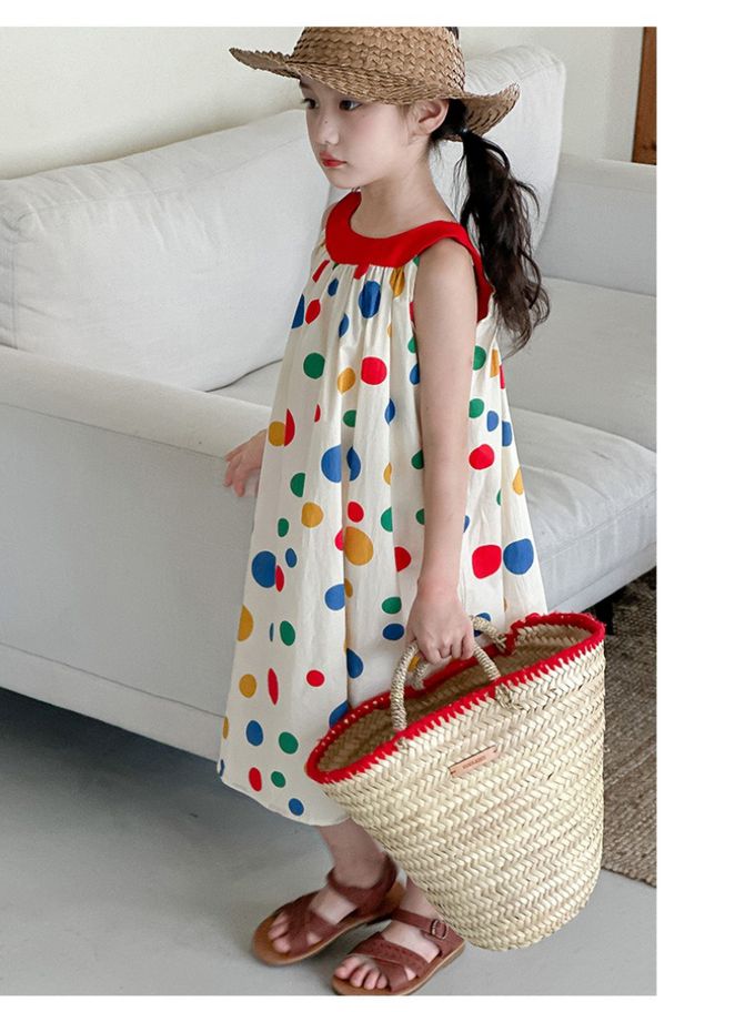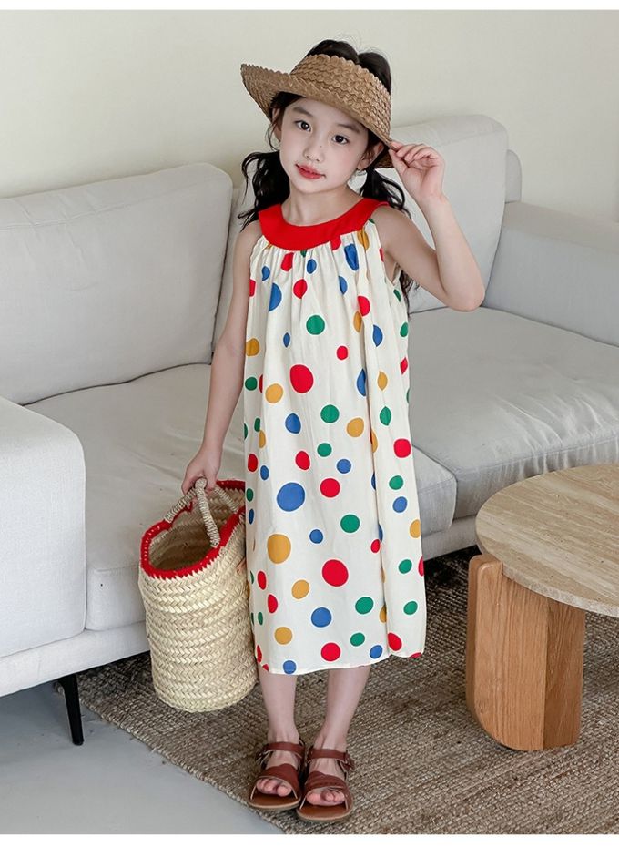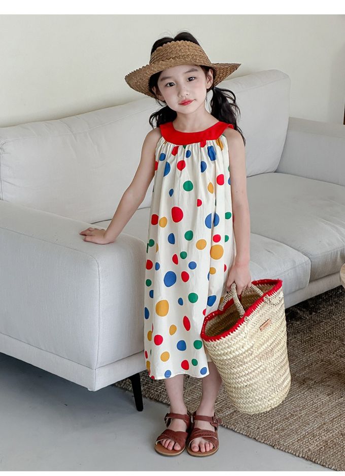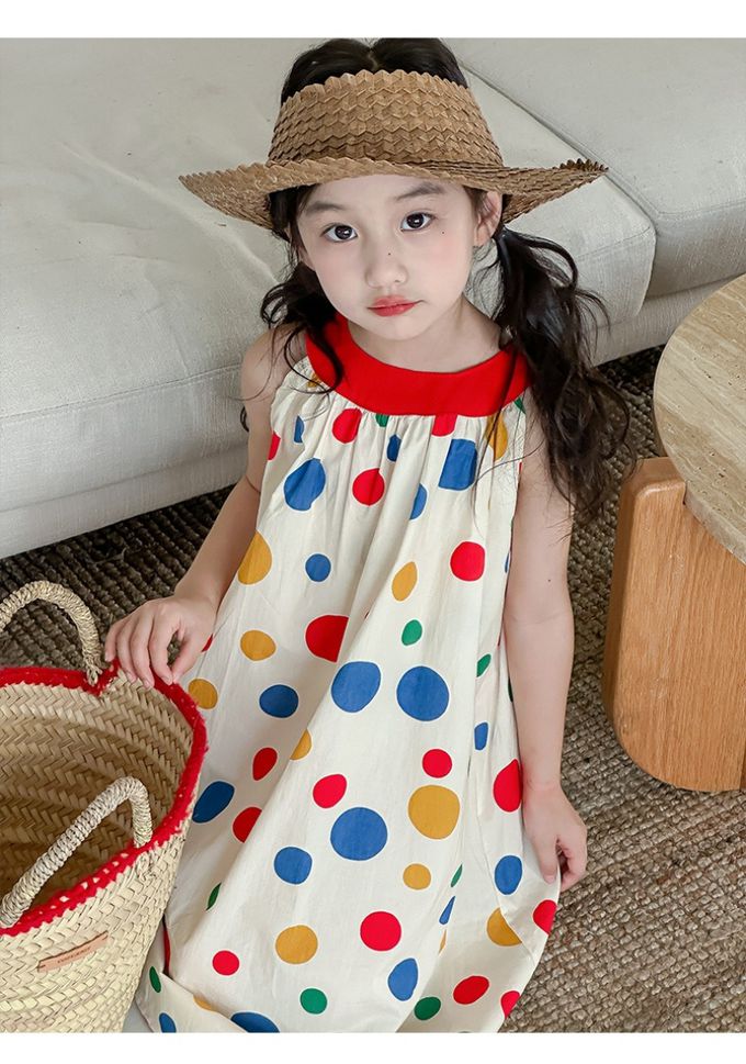 撞色露背無袖中長版洋裝-彩色點點-米白