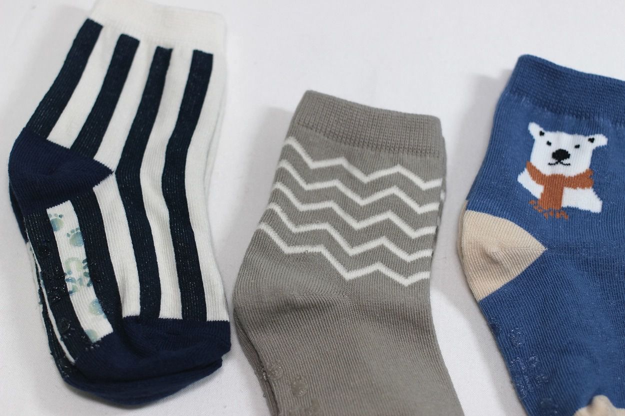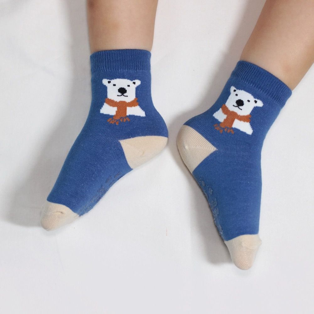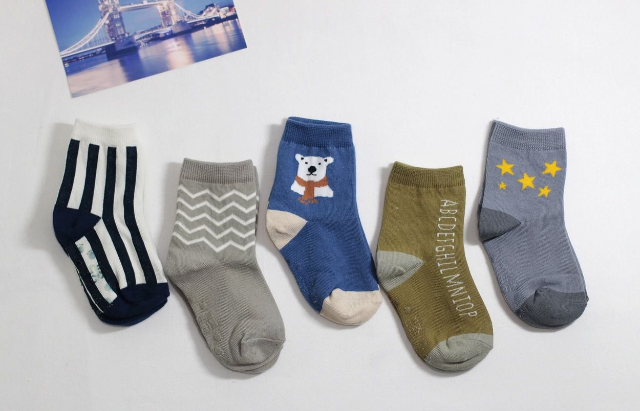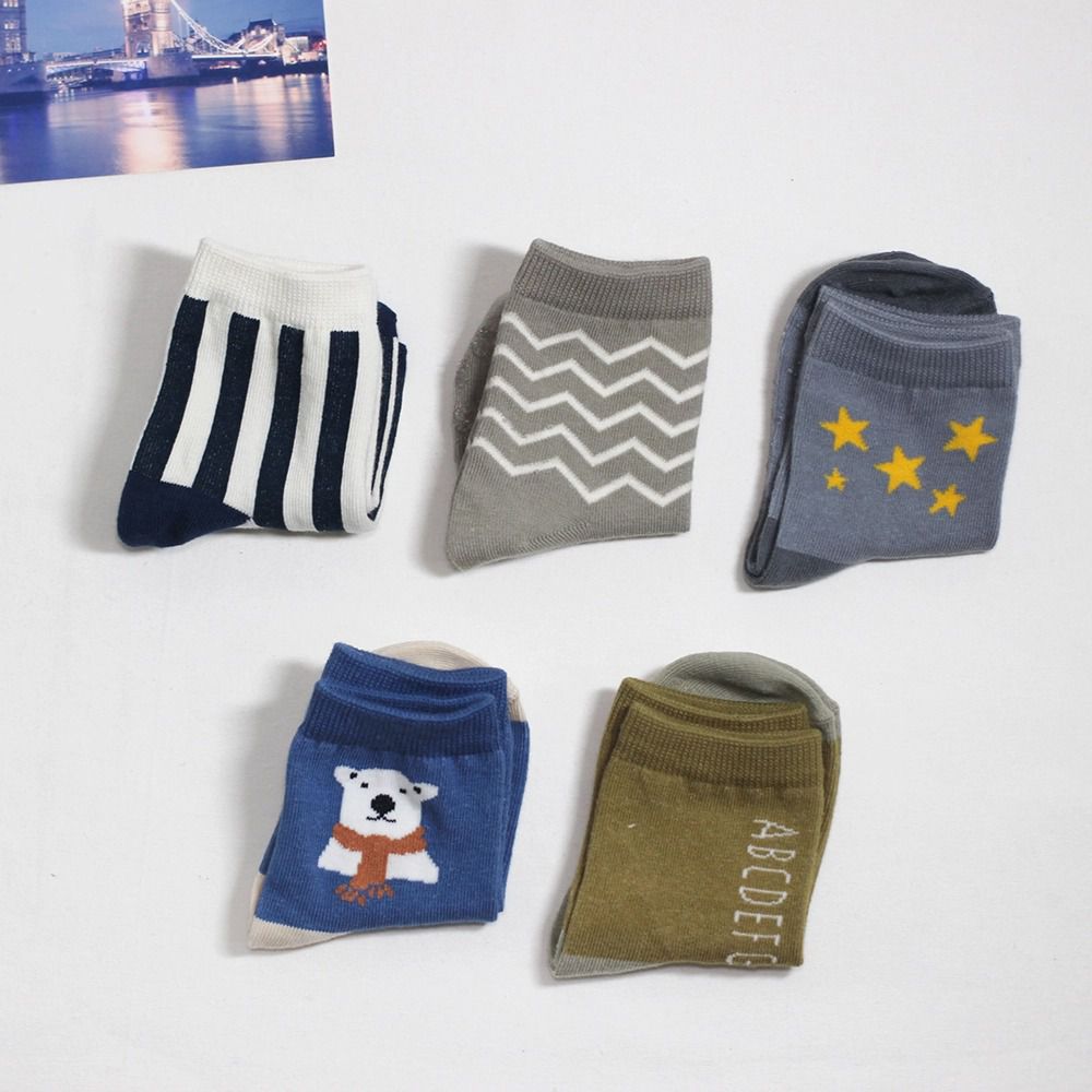 韓國南大門童裝 - (五入組)韓製兒童中筒襪-小星星北極熊-灰X藍X綠