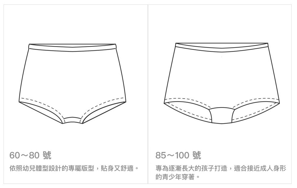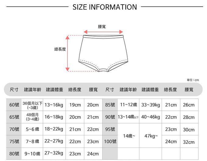 60[適穿年齡~3Y;體重13~16kg]、65[適穿年齡3~4Y;體重16~18kg]、70[適穿年齡5~6Y;體重18~22kg]、75[適穿年齡7~8Y;體重22~27kg]、80[適穿年齡9~10Y;體重27~32kg]、85[適穿年齡11~12Y;體重33~39kg]、90[適穿年齡13~14Y;體重40~46kg]、95[適穿年齡14Y~;體重47~kg;腰寬30cm]、100[適穿年齡14Y~;體重47~kg;腰寬32cm]