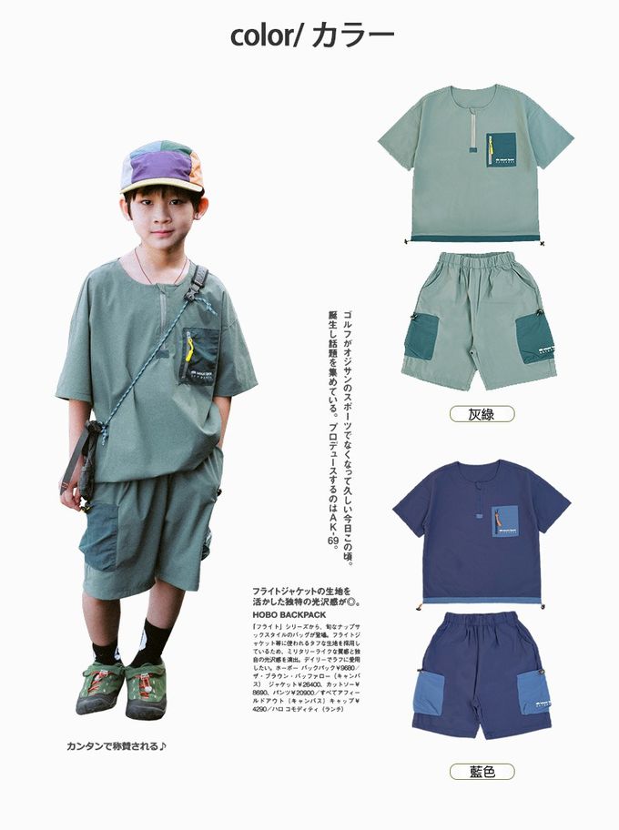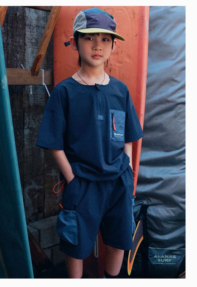 半開襟短袖上衣+五分褲兩件式套裝-撞色口袋-藍色